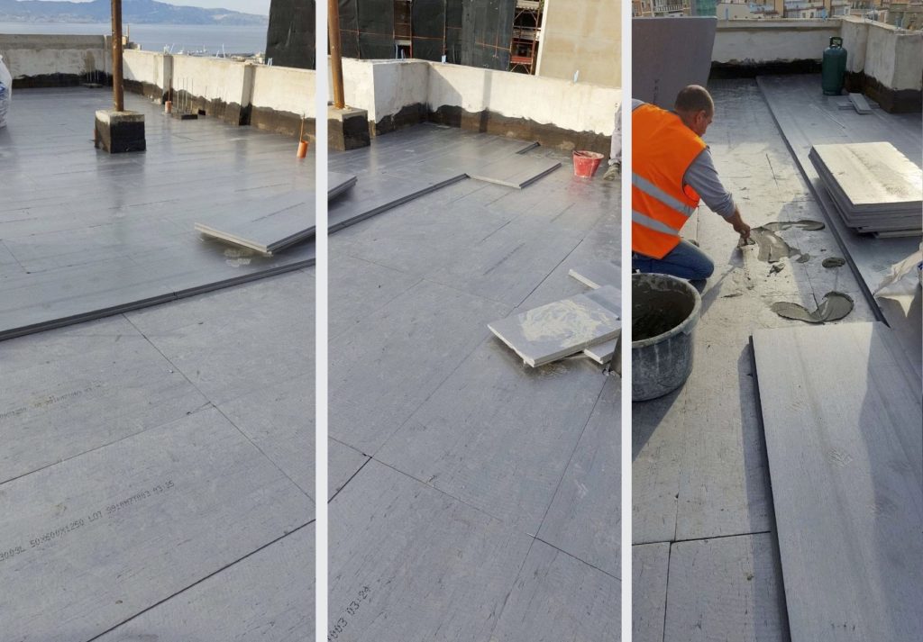 «È stato rimosso il massetto esistente risalente agli anni ’70, fatto con sabbia e cemento, ed è stato tolto gran parte dello strato di impermeabilizzazione bituminosa esistente. Si è proceduto quindi alla realizzazione di un massetto alleggerito e di una nuova impermeabilizzazione su cui sono stati posati due pannelli Ravatherm Xps X 300 Sl di spessore 5 cm, per un totale di 10 cm, coperti poi da massetto finale su cui è stata posata la nuova pavimentazione ceramica ad alta riflettanza», spiega l’ingegner Canale.