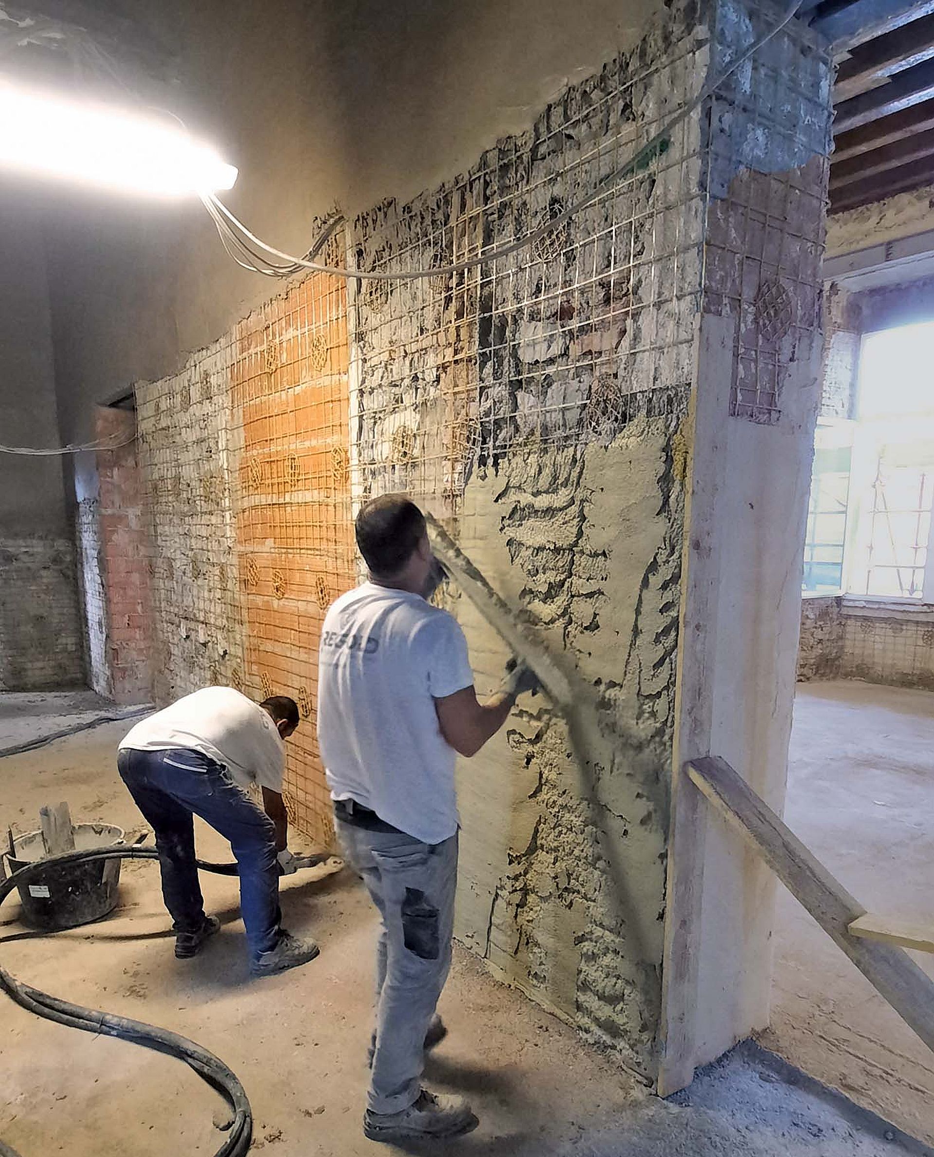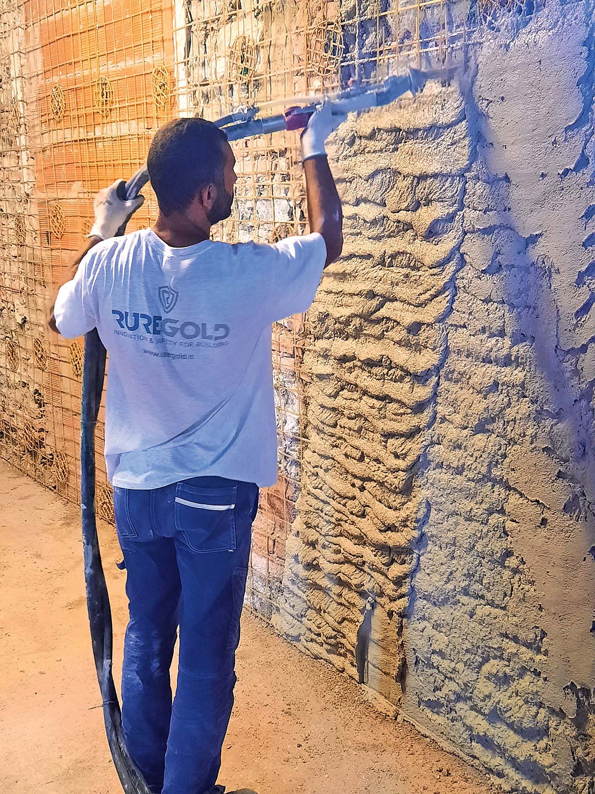 Per il rinforzo delle strutture murarie la scelta è ricaduta sul sistema di Intonaco Armato Ruregold, una soluzione che consente di incrementare i parametri di resistenza e duttilità portando anche a un incremento delle rigidezze traslazionali dei pannelli murari oggetto di rinforzo, con una conseguente migrazione del centro di rigidezza a livello di piano. Il Sistema Crm Ruregold qui applicato è costituito dalla rete G-Mesh 490 preformata in materiale composito Gfrp (Glass Fiber Reinforced Polymer), utilizzata in combinazione con il sistema di connessione in elementi preformati in fibra di vetro alcali resistente G-Mesh Connettore, i fazzoletti per la ripartizione delle concentrazioni di sforzo in corrispondenza delle connessioni G-Mesh Fazzoletto, l’elemento angolare G-Mesh Angolare e la malta Mx-Cp Calce a base di pura calce naturale NHL 3.5. L’applicazione dell’intonaco armato Sistema Crm Ruregold prevede innanzitutto la demolizione dell’intonaco esistente e l’asportazione di parti di muratura incoerenti o in distacco, con risarcitura di lesioni preesistenti ed eventuale rinzaffo di preparazione del substrato.