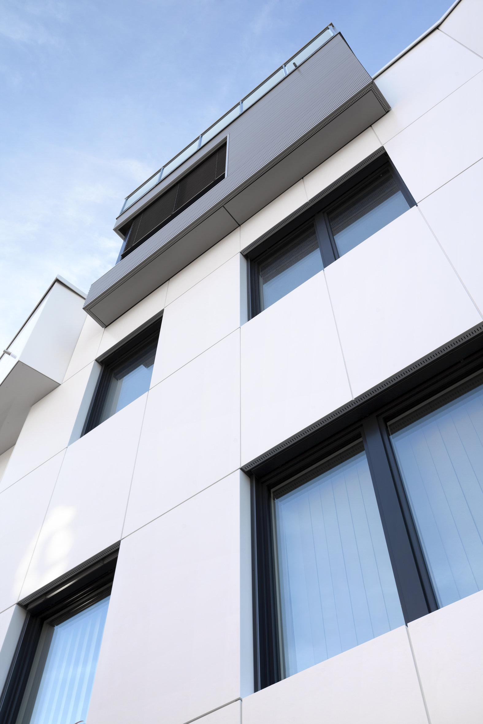 L’architettura dell’edificio nella sua nuova configurazione riflette le diverse aree funzionali – abitazione e lavoro – utilizzando materiali differenti: gli spazi destinati agli uffici, ai piani inferiori, sono rivestiti con una superficie high tech in colore bianco puro abbinata al vetro, mentre per i piani superiori si è scelto di realizzare una facciata a doghe orizzontali. Le diverse aree sono collegate tra loro mediante elementi cubici ricorrenti sui tre lati dell’edificio.