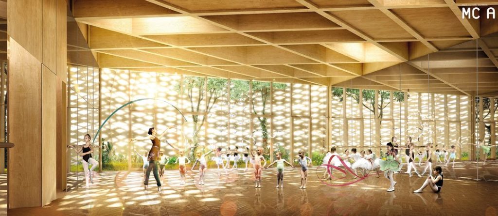 La sala di danza è un edificio a pianta rettangolare con la struttura e le finiture in legno di abete: alla semplicità formale e geometrica dell’impianto si affianca un sistema schermante esterno curvo, che circonda l’edificio delimitando due piccoli patii scoperti. Nei patii vi sono dei giardini visibili dalla sala di danza, che contribuiscono alla schermatura solare delle vetrate e al senso di privacy degli alunni durante le lezioni.