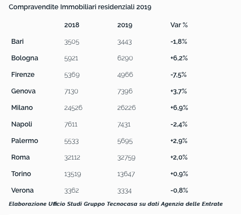 Le realtà più dinamiche in termini di scambi sono state Milano (+6,9%) e Bologna (+6,2%). Bene anche Genova (+3,7%). La capitale segna un +2,0%, confermando di non avere ancora intrapreso la strada della crescita in modo convinto, così come testimoniano anche i prezzi in ribasso in tutto il 2019. Diminuiscono le transazioni a Firenze (-7,5%), Napoli (-2,4%), Bari (-1,8%) e Verona (-0,8%).