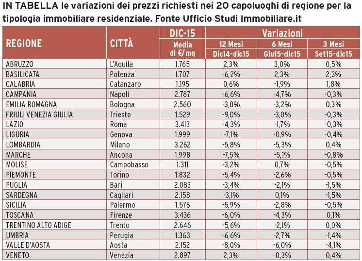 La riduzione più consistente dei prezzi si è registrata nelle regioni del Nord Italia, con una media del 5,7% e la Liguria fanalino di coda con prezzi a picco del 7,6%, seguita da Friuli Venezia Giulia (-7,3%) e Sicilia (-7,0%). La regione con il prezzo medio di vendita più elevato è il Trentino Alto Adige (3.014 euro al mq), mentre quella in cui il dato medio è il più basso è la Calabria, con 1.115 euro al mq richiesti a dicembre. Il capoluogo di regione che nel corso del 2015 ha subito il calo maggiore dei prezzi è Trieste: la città del Friuli Venezia Giulia ha vissuto una notevole contrazione, pari al 9%. In caduta libera anche il valore degli immobili ad Ancona (-7,5% in un anno) e a Genova (che perde il 7,1% in un anno ma arresta la discesa nel secondo semestre). In controtendenza la performance de L’Aquila, che vede un incremento del 2,3% sul prezzo medio di vendita nel settore residenziale.