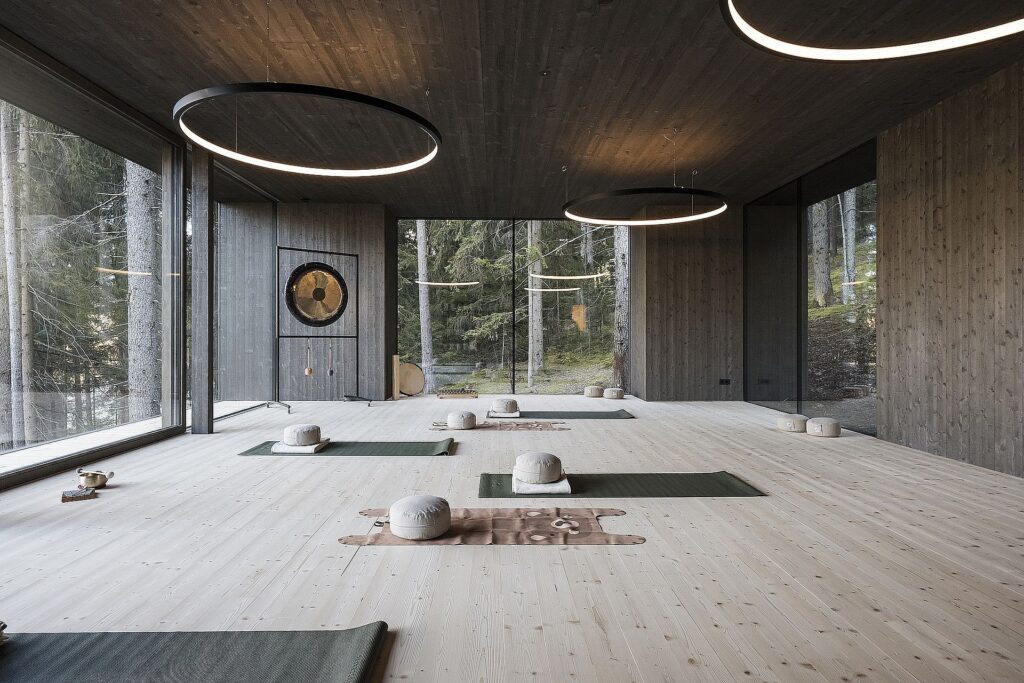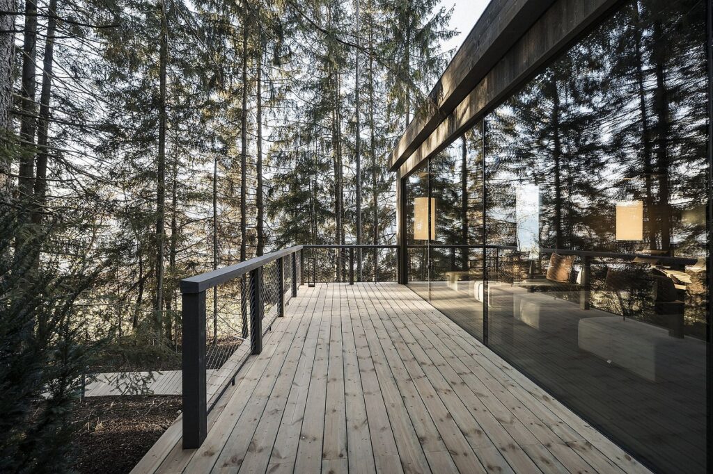 Le family suite sono dotate di ampie vetrature che stabiliscono una continuità visiva con l’ambiente esterno. Gli spazi interni privilegiano l’abete rosso naturale per rivestimenti e arredi, mentre i pavimenti sono realizzati in rovere.