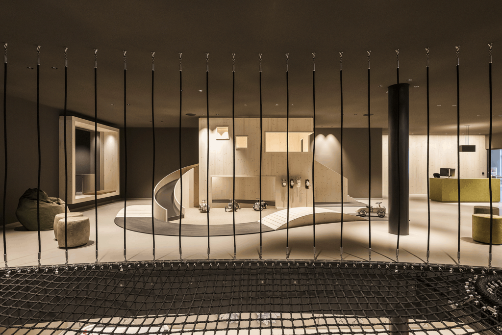 Nel corpo centrale, la zona reception include elementi ludici verticali (scivoli e reti per arrampicata) che consentono ai minori di spostarsi autonomamente tra i livelli. Le superfici vetrate interne garantiscono la sorveglianza visiva tra gli ambienti.