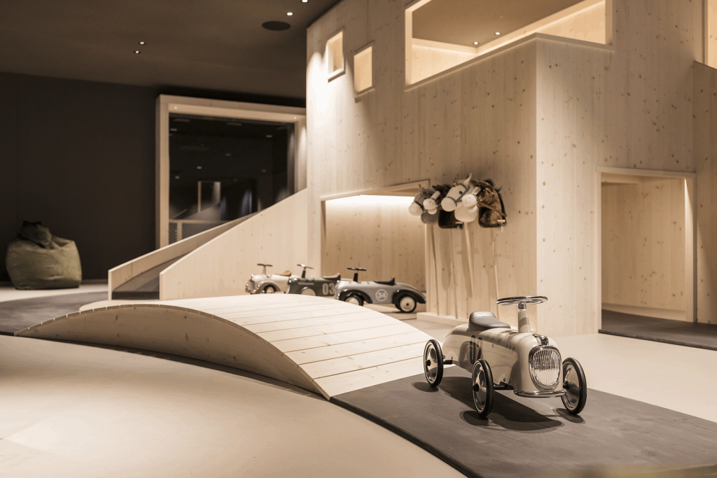 Le attrezzature per l’infanzia del family resort, sia interne che esterne, sono realizzate in legno naturale con lavorazioni artigianali. Le installazioni esterne comprendono aree gioco differenziate per fasce d’età, percorsi avventura e giochi d’acqua meccanici privi di componenti elettriche.