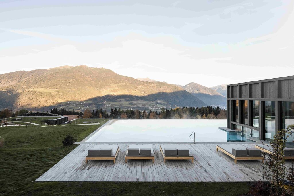 Il resort cinque stelle del Gruppo Adler Spa Resort & Lodges si caratterizza per l’integrazione con il contesto montano e l’impiego di materiali e tecniche costruttive locali.