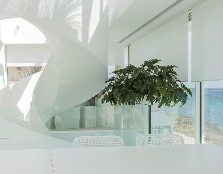 Infine si giunge alla Glass House, il livello più alto dell’abitazione che si affaccia direttamente sul mare, con i suoi grandiosi open space vetrati e superfici bianche. Al terzo piano della casa gallipolina le vetrate sono schermate internamente da 10 tende a rullo verticali filtranti con tessuto E-Screen bianco.