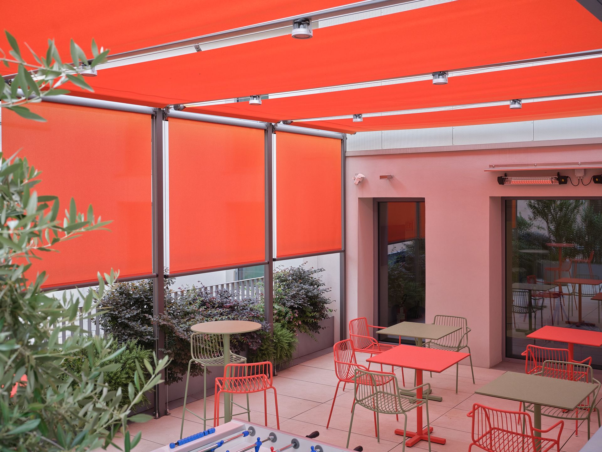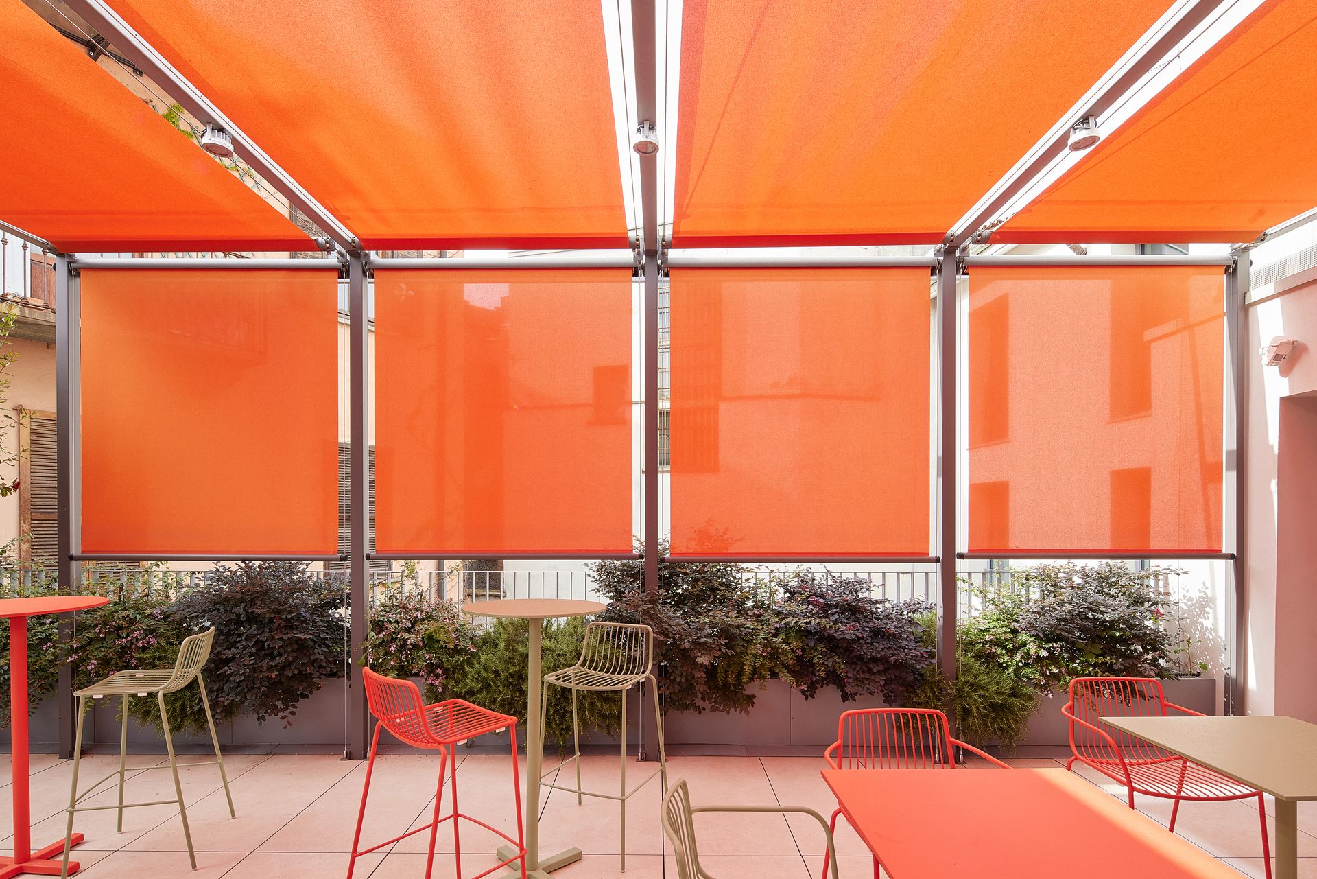 Il tessuto, con la sua tonalità accesa, non solo trasforma l’estetica dell’ambiente, ma crea anche un affascinante gioco di contrasti con l’architettura circostante, aggiungendo un tocco di energia e freschezza che rende la struttura un vero e proprio punto di riferimento di modernità e stile nel contesto urbano milanese.