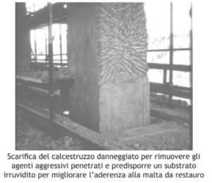 Lo spessore di calcestruzzo rimosso dev’essere almeno eguale a quello che, in base alla diagnosi del degrado delle strutture in calcestruzzo, risulta essere ormai penetrato dagli agenti aggressivi (cloruro, solfato…) anche se ancora non completamente danneggiato; i residui di precedenti interventi non perfettamente aderenti, come anche oli, grassi, vernici superficiali, ecc., dovranno essere ugualmente rimossi; un irruvidimento ideale del sottofondo corrisponde a una superficie con asperità di circa 5 mm; pulire i ferri di armatura da polvere e ruggine incoerente mediante sabbiatura; applicare eventualmente nuovi ferri di armatura se previsti dal progetto di restauro.