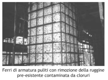 Lo spessore di calcestruzzo rimosso dev’essere almeno eguale a quello che, in base alla diagnosi del degrado delle strutture in calcestruzzo, risulta essere ormai penetrato dagli agenti aggressivi (cloruro, solfato…) anche se ancora non completamente danneggiato; i residui di precedenti interventi non perfettamente aderenti, come anche oli, grassi, vernici superficiali, ecc., dovranno essere ugualmente rimossi; un irruvidimento ideale del sottofondo corrisponde a una superficie con asperità di circa 5 mm; pulire i ferri di armatura da polvere e ruggine incoerente mediante sabbiatura; applicare eventualmente nuovi ferri di armatura se previsti dal progetto di restauro.