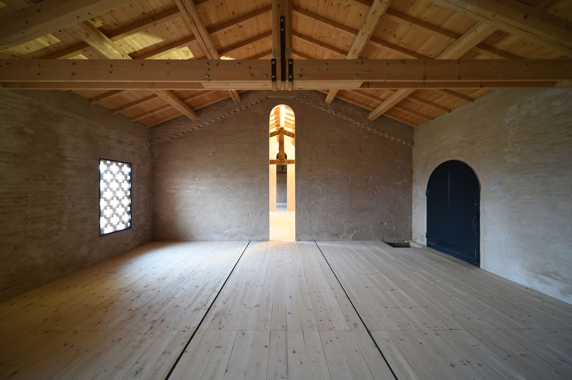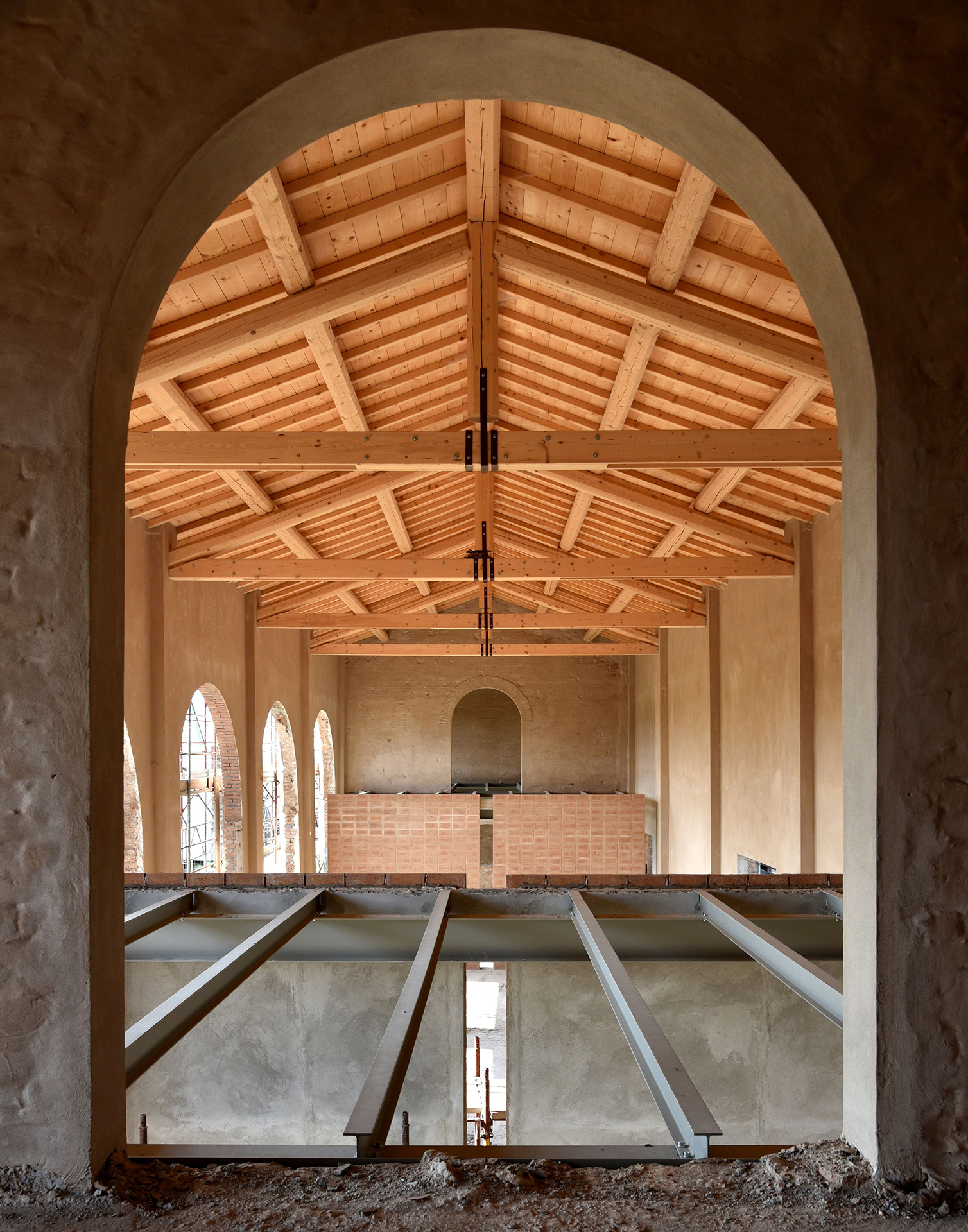 Recupero dell’invaso spaziale originario della navata baricentrica, con la nuova copertura in carpenteria lignea.