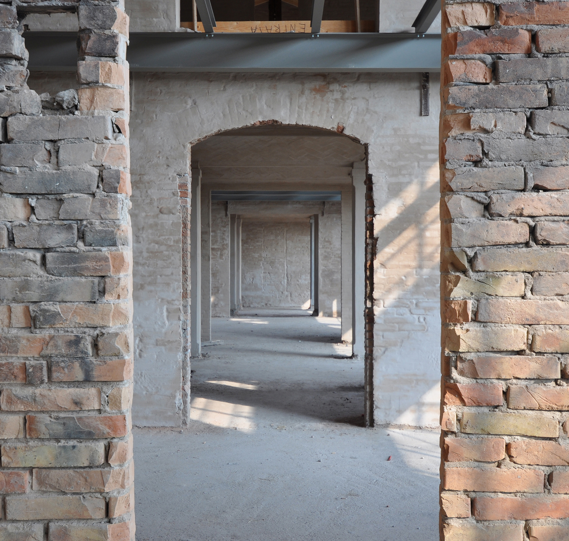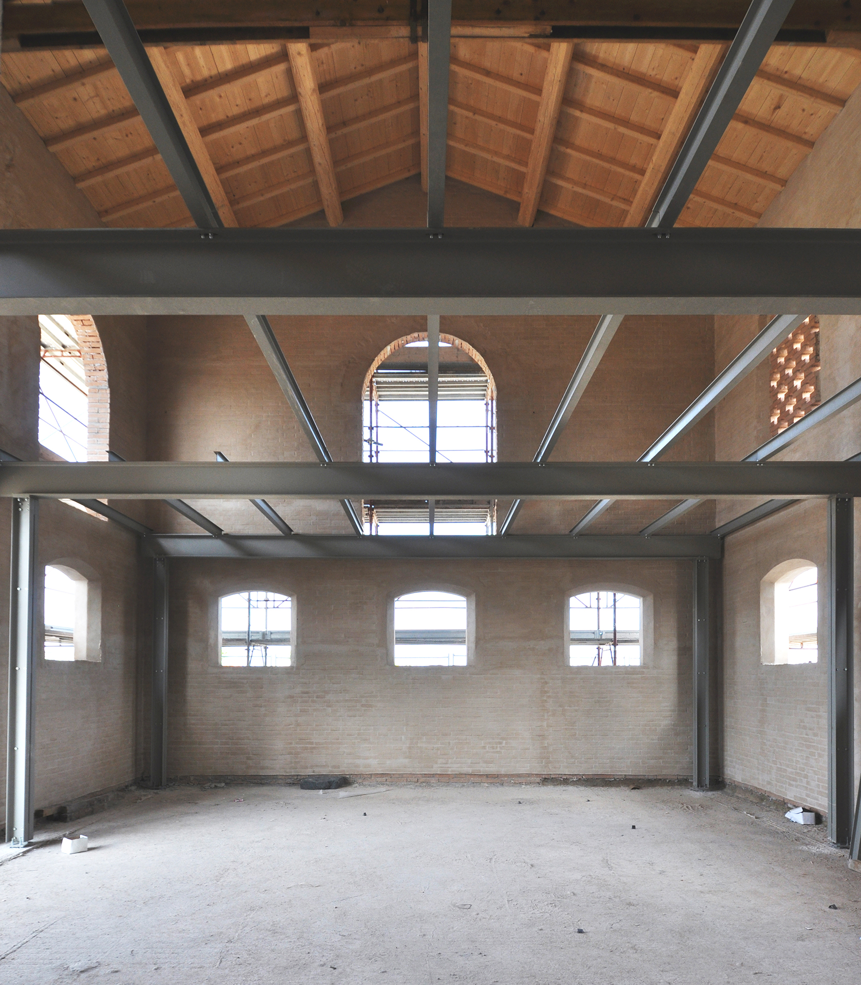 Il restauro dell’involucro murario è anzitutto opera di liberazione e di consolidamento statico. Liberazione dalle degradanti tramezzature in forati (scarsamente funzionali all’esercizio delle attività), dalle crudeli tamponature delle finestre originarie, dai solai in laterocemento (fortemente compromessi dal sisma, in parte crollati e comunque protesi ben oltre il limite delle proprie resistenze), dagli intonaci dissonanti del piano terra, coprenti la storia della fabbrica. E recupero totale di tutti gli elementi superstiti, anzitutto il caldo paramento murario in mattoni.