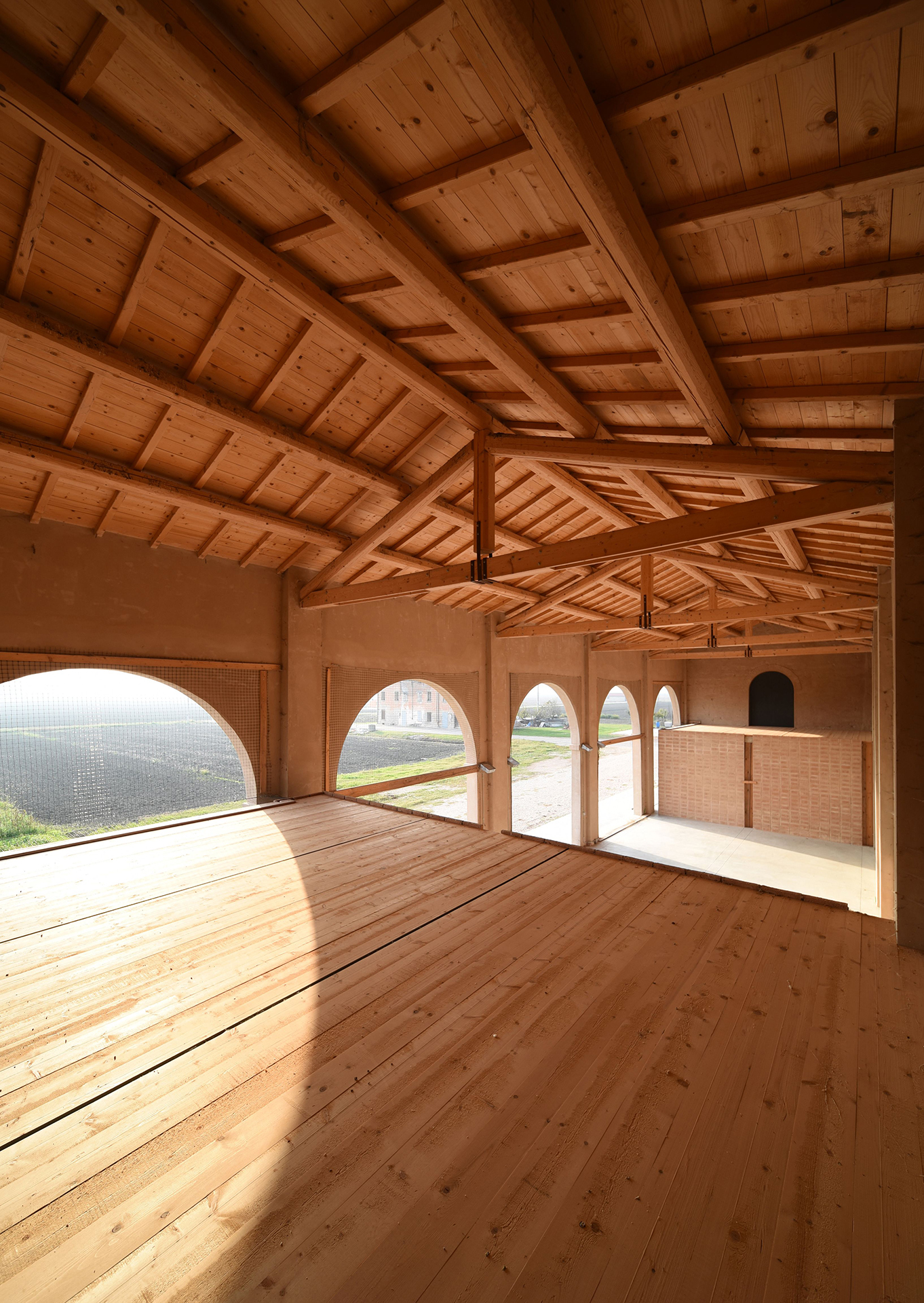 Dai rispettivi impalcati, attraverso le finestre esistenti (sul retro) e quelle ad arco riaperte (sui lati sud ed est) si ha una “vista lunga” sulla campagna infinita. Il parziale svuotamento dei volumi interni consente l’amplificazione degli spazi, in profondità e in altezza, conferendo il senso di un’abitazione comoda, niente affatto costretta dalla tirannìa di quei miseri quattro metri rappresentati dall’effettiva larghezza dei locali a disposizione. La struttura degli impalcati è costituita da un cassettonato di profili di ferro composti rivestiti da tavole di rovere. Il “guscio” dell’abitazione è foderato all’interno da uno strato isolante in lana di roccia (spessore 12 cm).