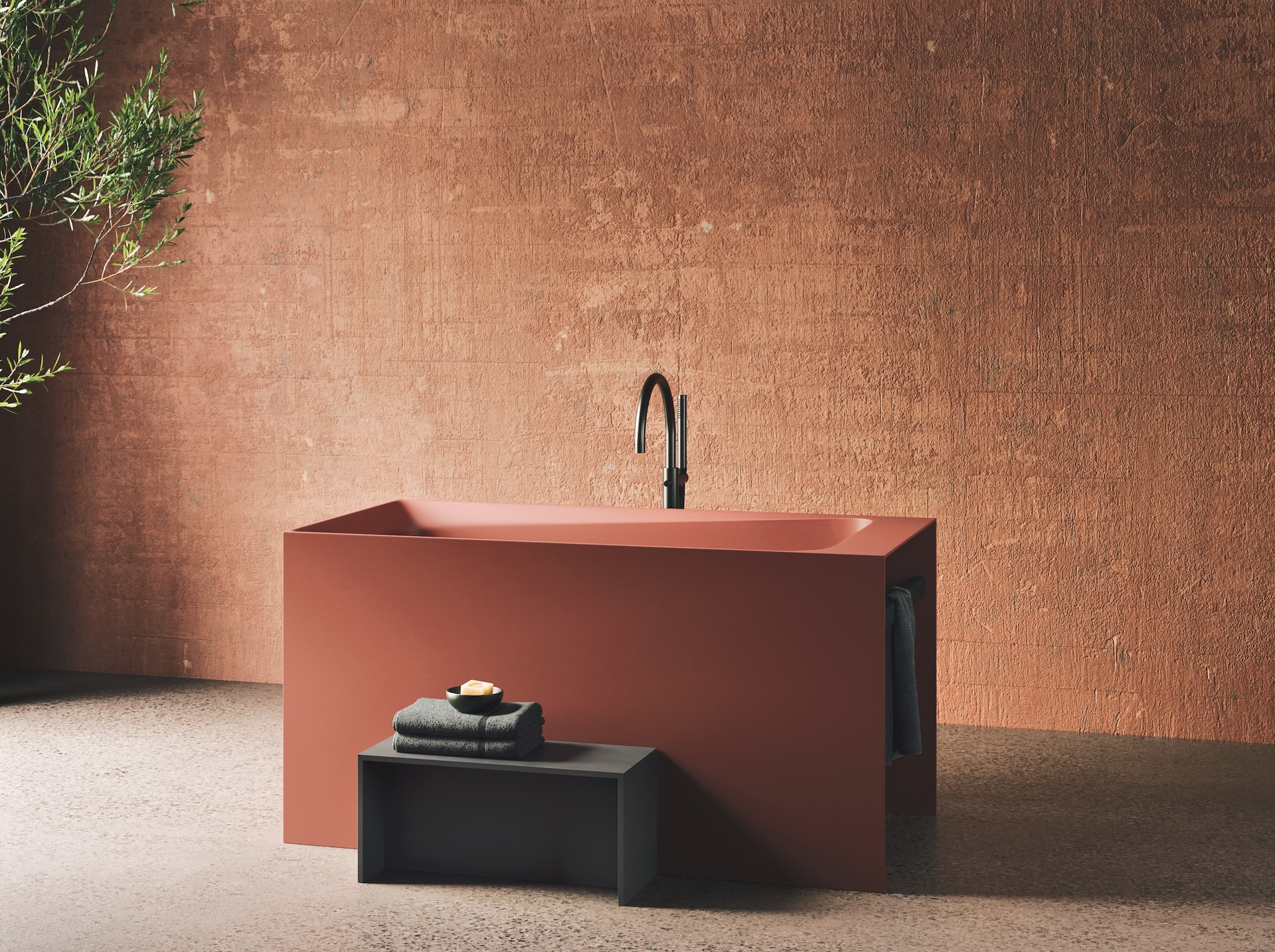 Di agevole accesso grazie a un rialzo in Corian, la vasca è realizzata in materiali altamente resistenti come Shark e Korakril, in un’ampia gamma cromatica tra cui un caldo rosso argilla.
