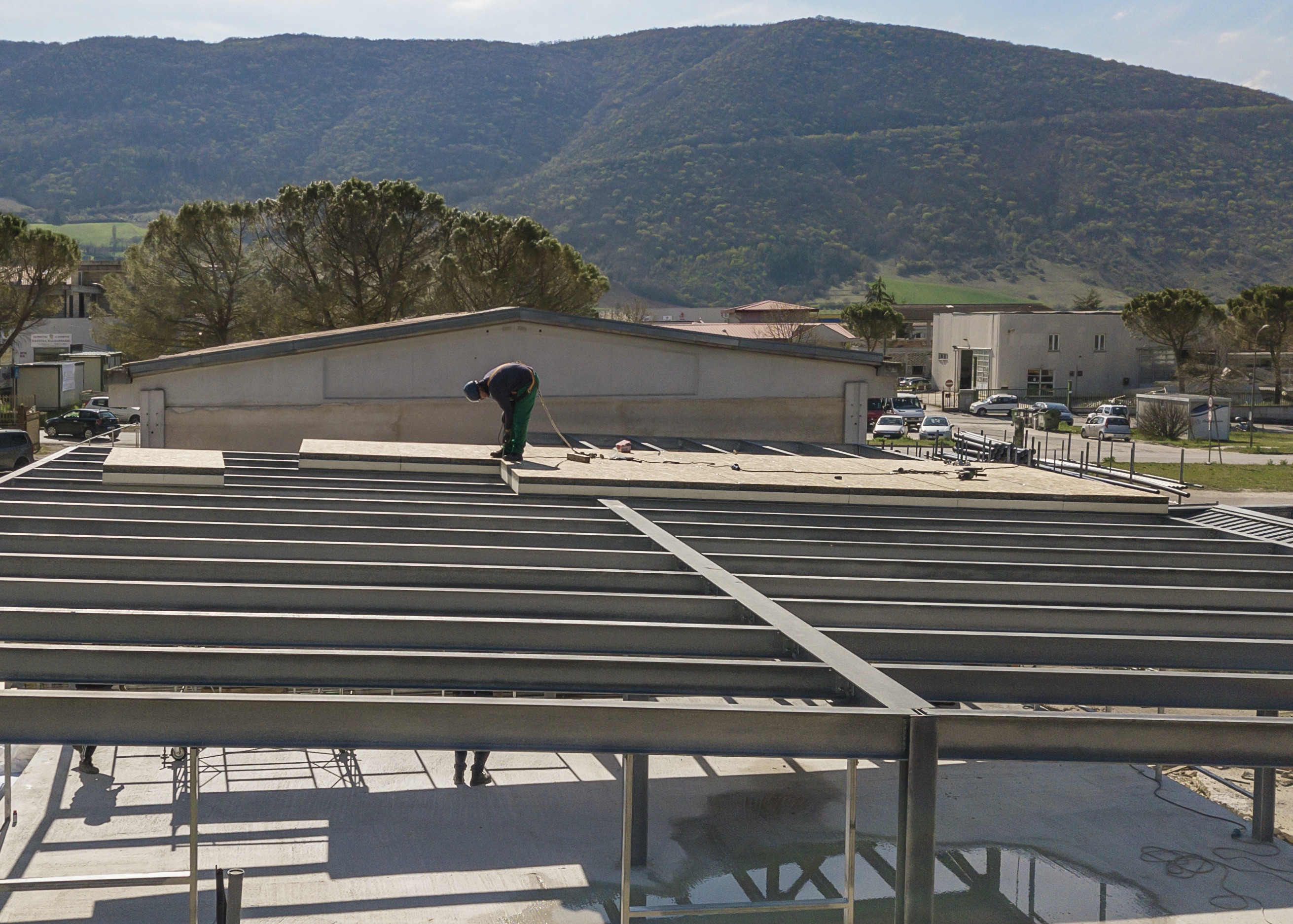 La soluzione adottata per la copertura piana dell’edifico ha previsto l’applicazione, mediante fissaggio meccanico, di un pannello sandwich composito, Poliiso Wr Lc prodotto dalla società Ediltec e fornito dalla rivendita Felc di Trevi. Poliiso Wr Lc si caratterizza per la diversa natura e la diversa funzione degli strati che lo compongono e per la presenza, sul lato all’intradosso della copertura, di un pannello in legno di abete multistrato che ne consente l’impiego a vista.