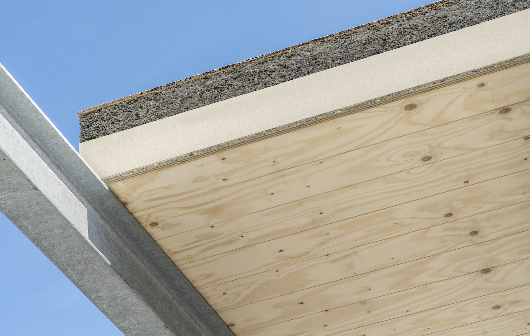 Il prodotto è stato sviluppato per offrire al mercato la possibilità di risolvere, con l’applicazione di un solo pannello composito, le diverse esigenze dell’elemento di copertura. Tra queste la più importante, in termini di efficienza energetica e di sostenibilità ambientale dell’edificio, è quella di garantire un’adeguata resistenza termica ed è risolta grazie all’impiego del pannello in schiuma poliuretanica Poliiso Plus, dotato di rivestimenti in carta metallizzata, che offre eccellenti prestazioni di conducibilità termica dichiarata (λD= 0,022 W/mK). Sulle superfici del pannello Poliiso Plus vengono incollati, con procedimenti industriali che garantiscono la stabilità dei legami, i diversi strati che compongono il sistema: sul lato all’intradosso una lastra di OSB di spessore di 10 mm che funge da supporto al pannello prefinito in legno di abete di spessore 12 mm; sul lato all’estradosso un pannello in legnocemento di 75 mm di spessore e una lastra in OSB da 10 mm utilizzata come piano di posa degli elementi adottati come manto di copertura. Oltre alle prestazioni isolanti, il sistema offre valori di massa che, pur senza appesantire eccessivamente la struttura, ne migliorano il comportamento estivo ed acustico. Ai vantaggi prestazionali del sistema Poliiso Wr Lc vanno sommati quelli applicativi che hanno consentito, grazie al grande formato degli elementi – 1200 x 2000 mm – una posa molto veloce e interamente realizzata a secco, rispettosa quindi dei criteri di disassemblabilità delle strutture che sono tra i principi fondanti dell’edilizia sostenibile e dell’economia circolare applicata al settore delle costruzioni.