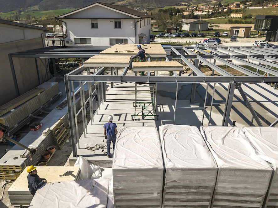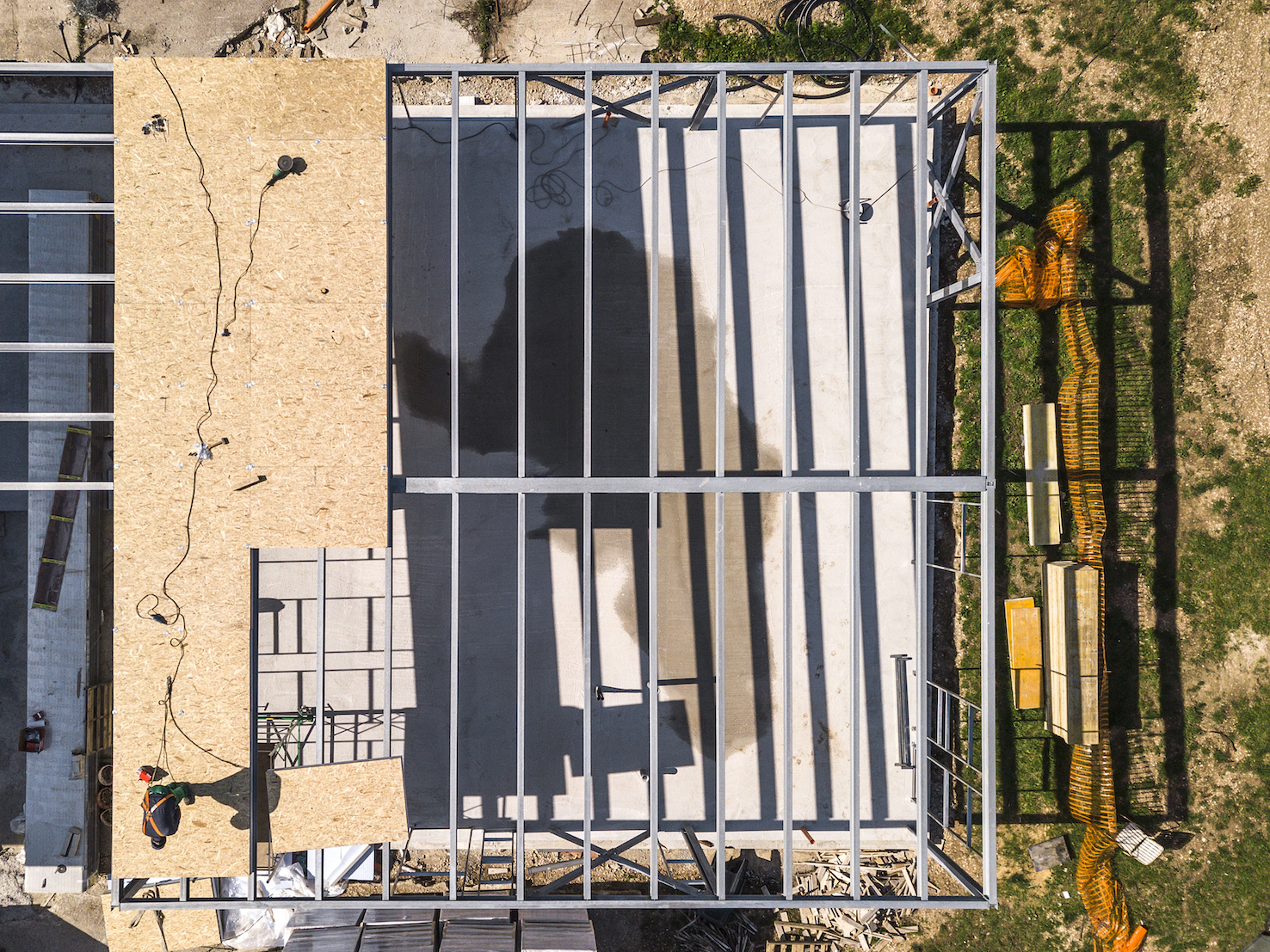 La nuova realizzazione ha previsto, al di sopra di una robusta platea di fondazione in calcestruzzo armato, l’elevazione di un telaio formato da profilati in acciaio di sezione Ipe He collegati mediante squadrette bullonate e controventato da croci in alcune delle campate perimetrali. Oltre agli aspetti antisismici i progettisti hanno attentamente valutato quelli dell’efficienza energetica della struttura e del comfort abitativo.