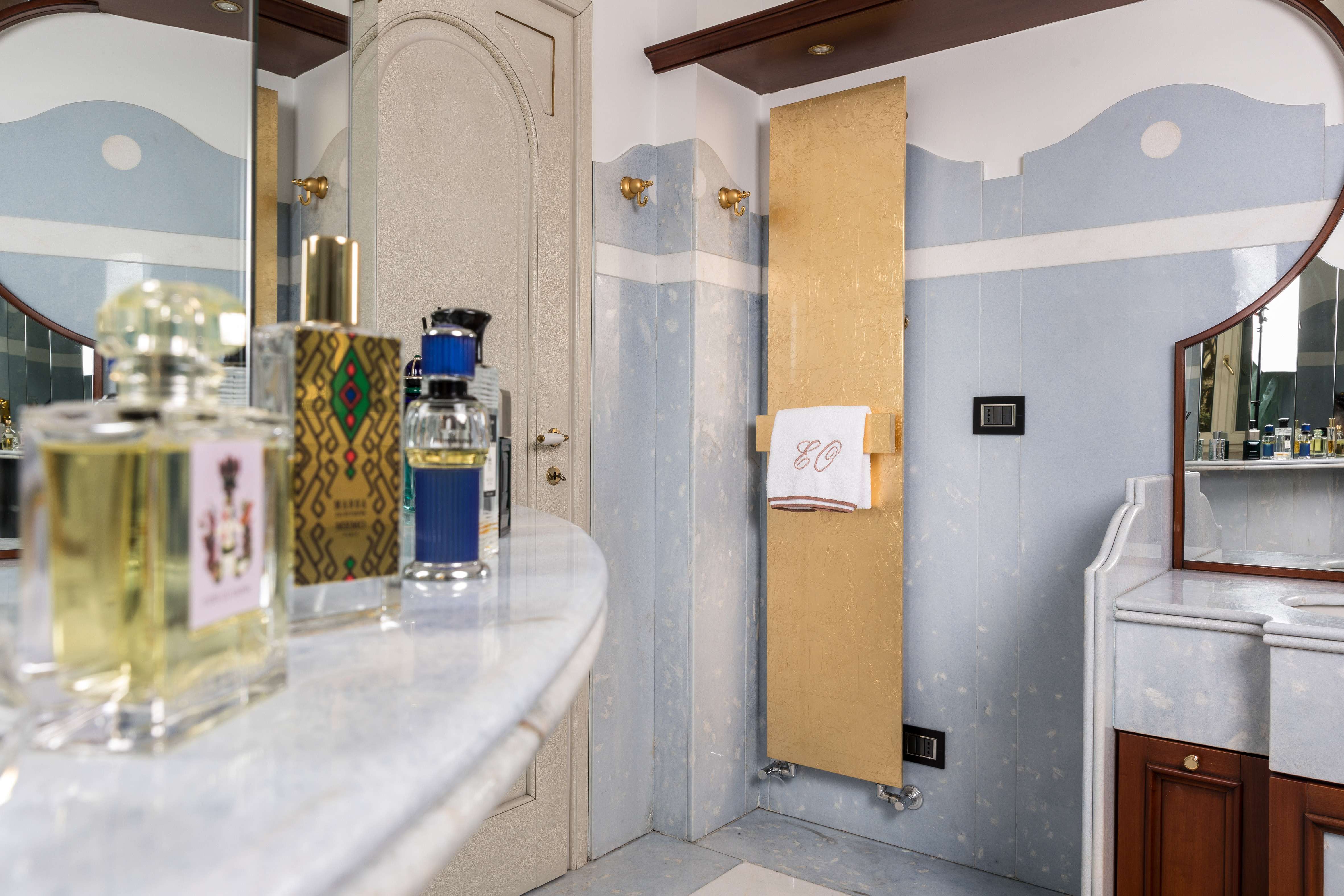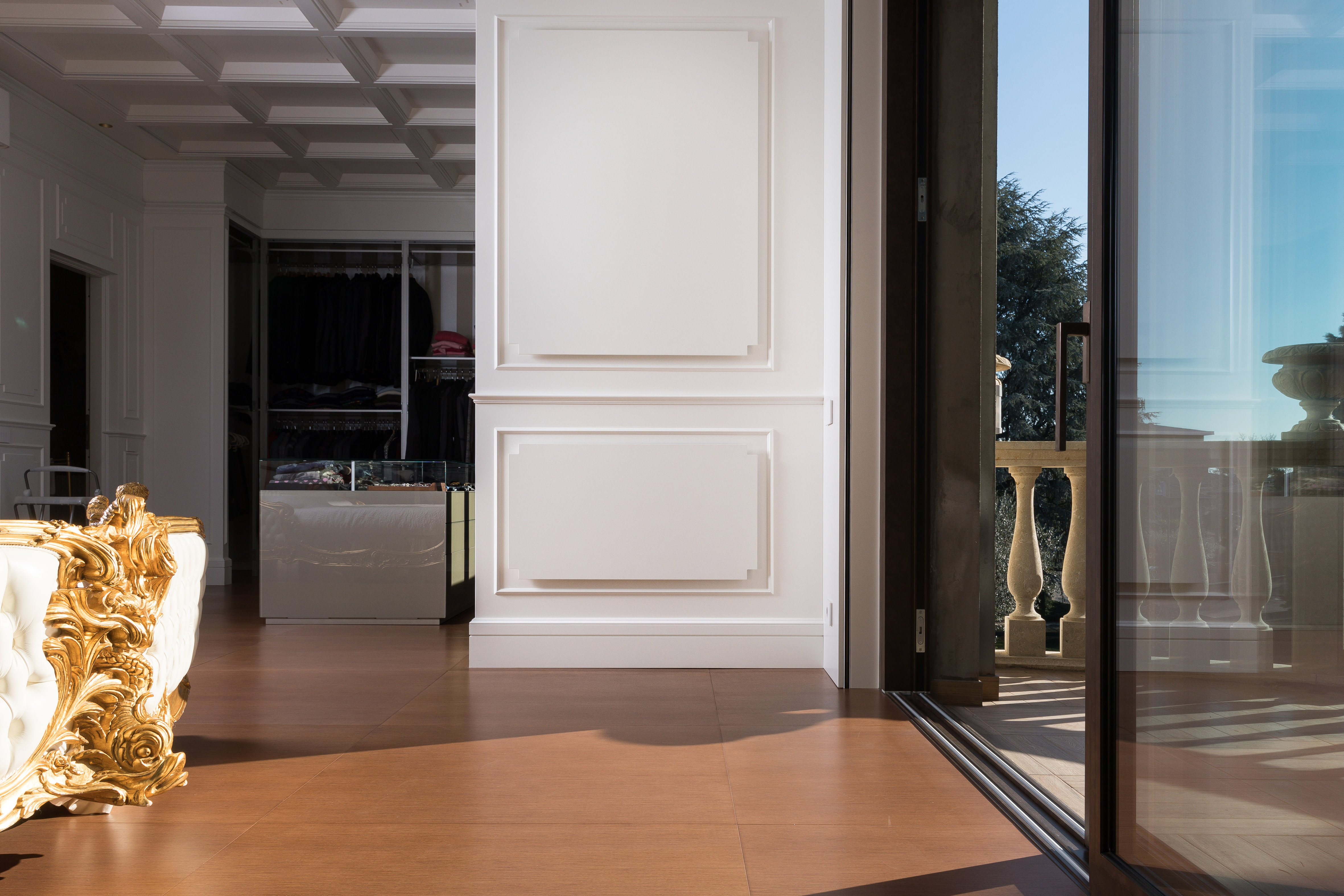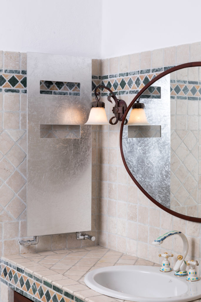 Per gli ambienti bagno sono stati scelti Othello Zenith, qui proposto nella finitura bianca RAL 9016 sablé e Marron d’Inde SW208F, e due dei modelli di piastre di Ridea: Smooth e Easy nelle pregiate versioni foglia d’oro e foglia d’argento.