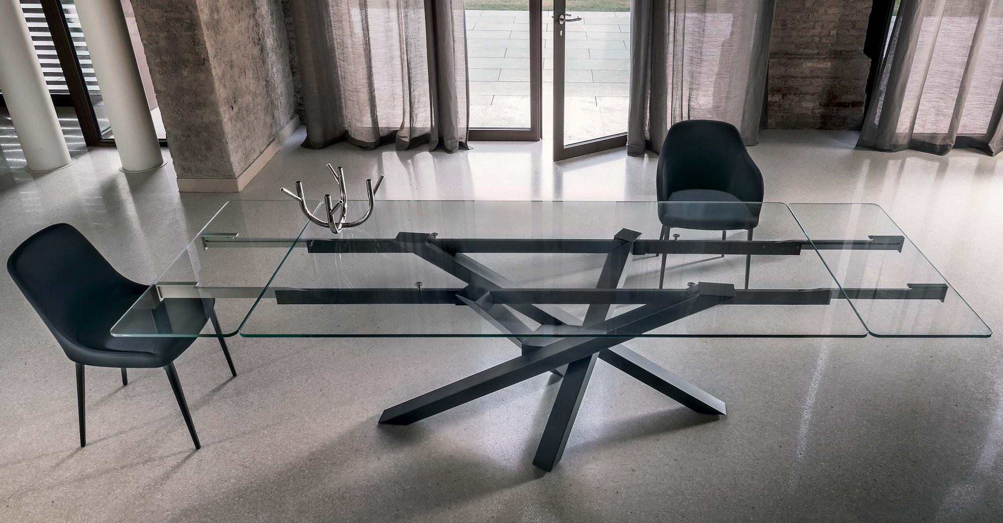 Shangai e Living nelle versioni allungabili rappresentano una soluzione adatta ad ogni spazio. Entrambe le collezioni di Riflessi si caratterizzano per un basamento centrale che rende il tavolo allo stesso tempo originale e pratico (non avendo gambe alle estremità è possibile inserire sedie al di sotto di esso senza ostacoli) e grazie al comodo meccanismo con allunghe è possibile estendere il piano, aggiungendo altri posti a tavola senza sforzi.