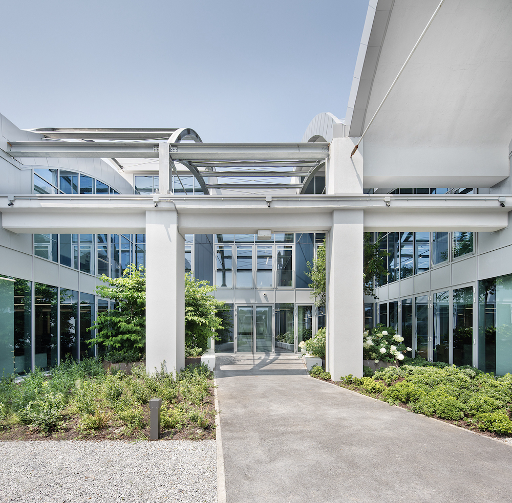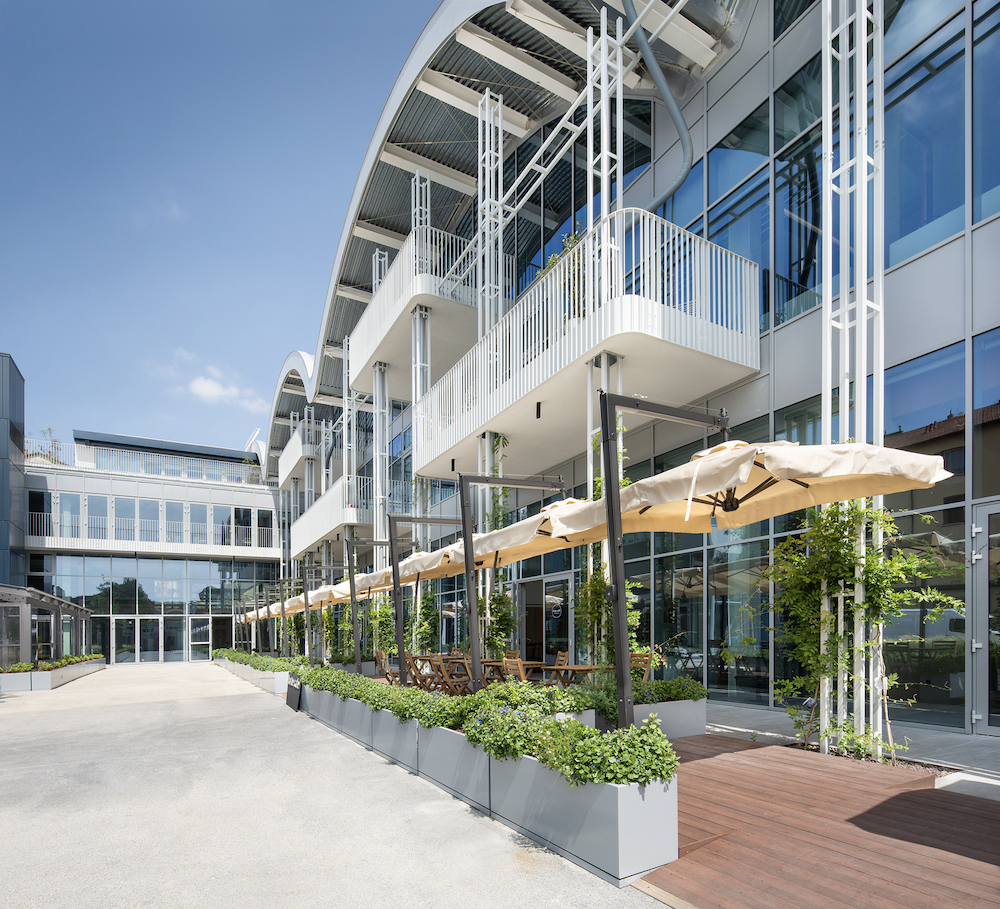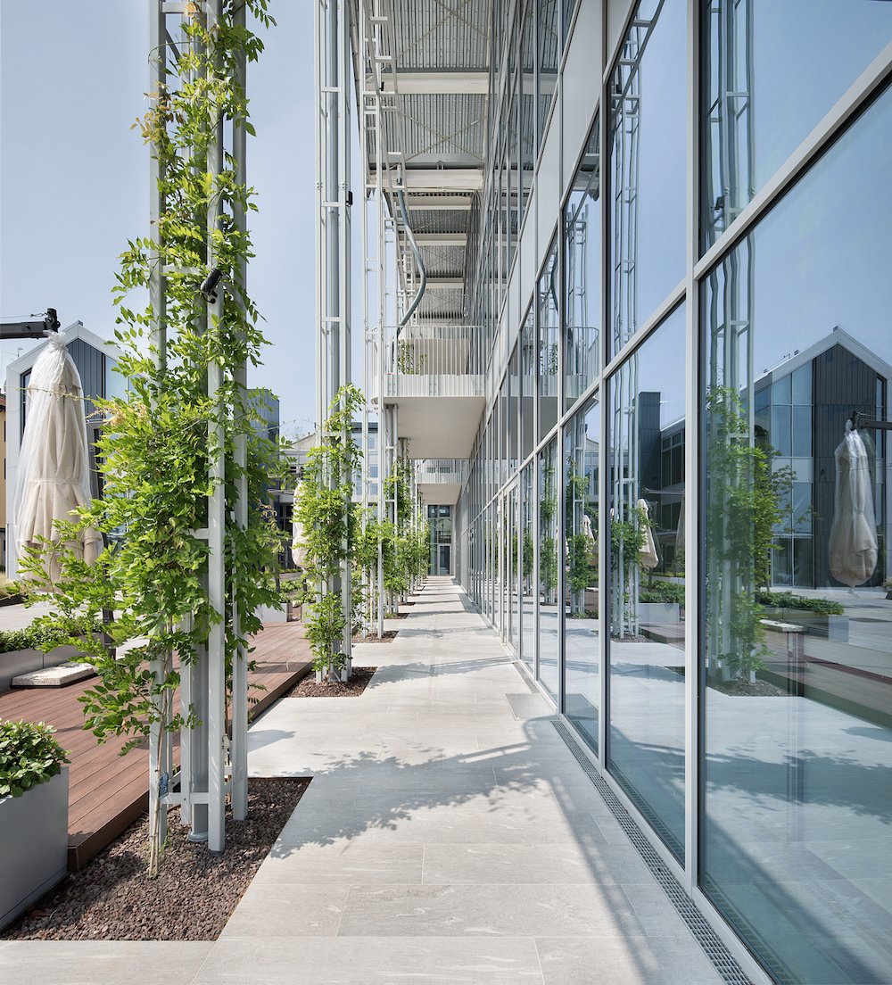 La facciata vetrata del nuovo edificio sulla piazza è scandita verticalmente da pilastri reticolari che si innestano nelle grandi terrazze sospese pensate come spazio di lavoro informale all’aperto ma anche come schermature solari. I pilastri reticolari passanti sono stati concepiti per accogliere la crescita di rigogliosi glicini.