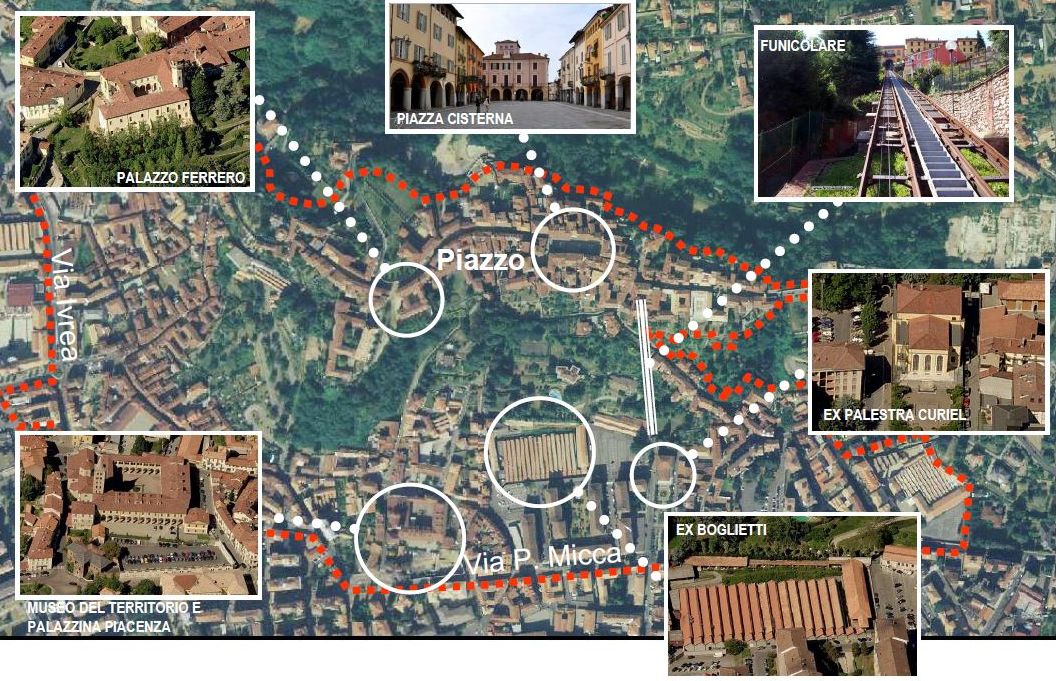 - valorizzazione dell’itinerario turistico, riqualificazione ambientale degli spazi urbani d’interesse storico, realizzazione di segnaletica infomonumentale e installazione di complementi di arredo urbano attraverso la creazione di un percorso pedonale che colleghi il polo culturale di Biella Piano con i palazzi storici del Piazzo, puntando su una strategia di comunicazione (anche tecnologica) dei luoghi e delle iniziative oltre a rinnovarne l’immagine con la riqualificazione fisica e ambientale degli spazi pubblici;