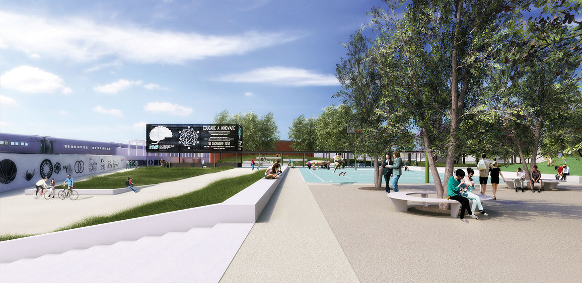- riqualificazione di piazzale Europa, centro fisico e display comunicativo del Parco Innovazione; la piazza sarà un nuovo spazio pubblico multifunzione in grado di generare qualità urbana per l’intero quartiere e mettere in connessione l’area con il centro storico della città.