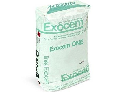 Il materiale Exocem One, prodotto da Ruredil, è un premiscelato a base di cemento, inerti selezionati, additivi superfluidificanti, agenti per il controllo del ritiro sia in fase plastica che in fase indurita e fibre di polipropilene. Dopo l’aggiunta di acqua si ottiene una malta tixotropica, fortemente adesiva, a rapido indurimento e di alta durabilità da applicare in spessori compresi tra 3 e 40 mm. La particolare formulazione ne consente l’impiego per riparazioni in spessore e per rivestimenti millimetrici (rasatura).