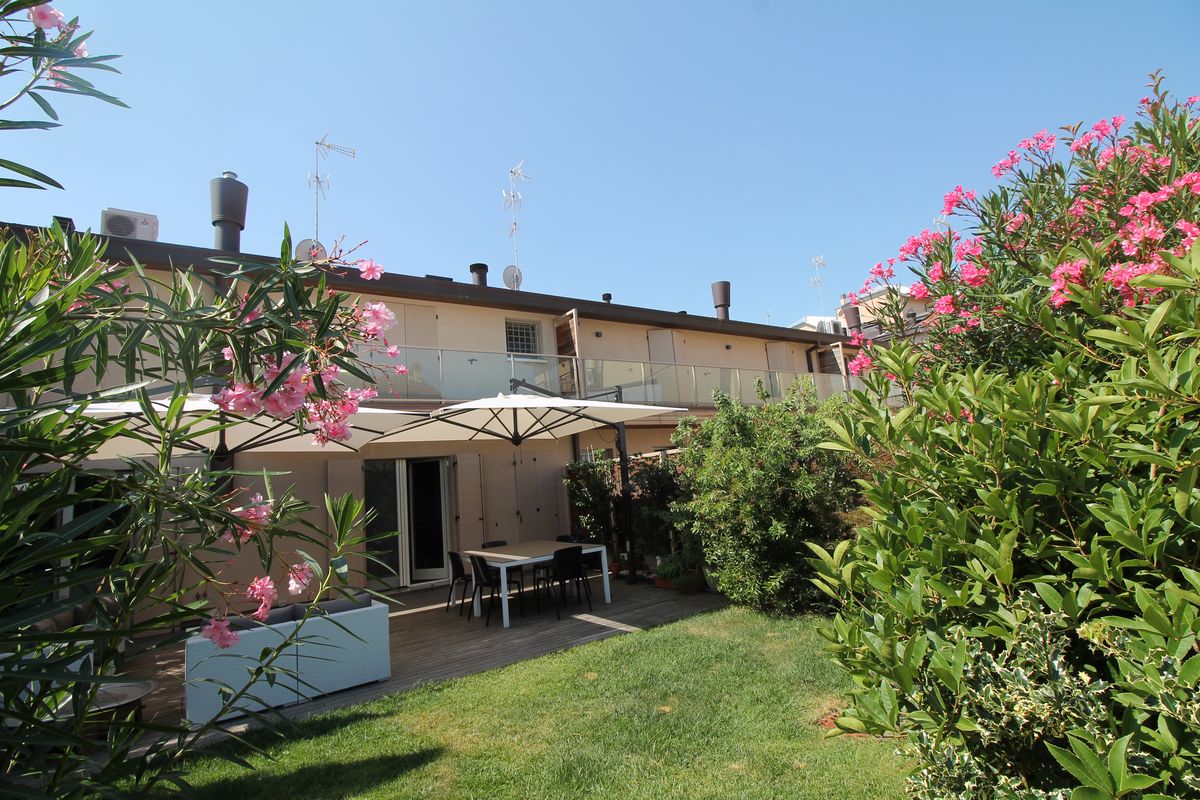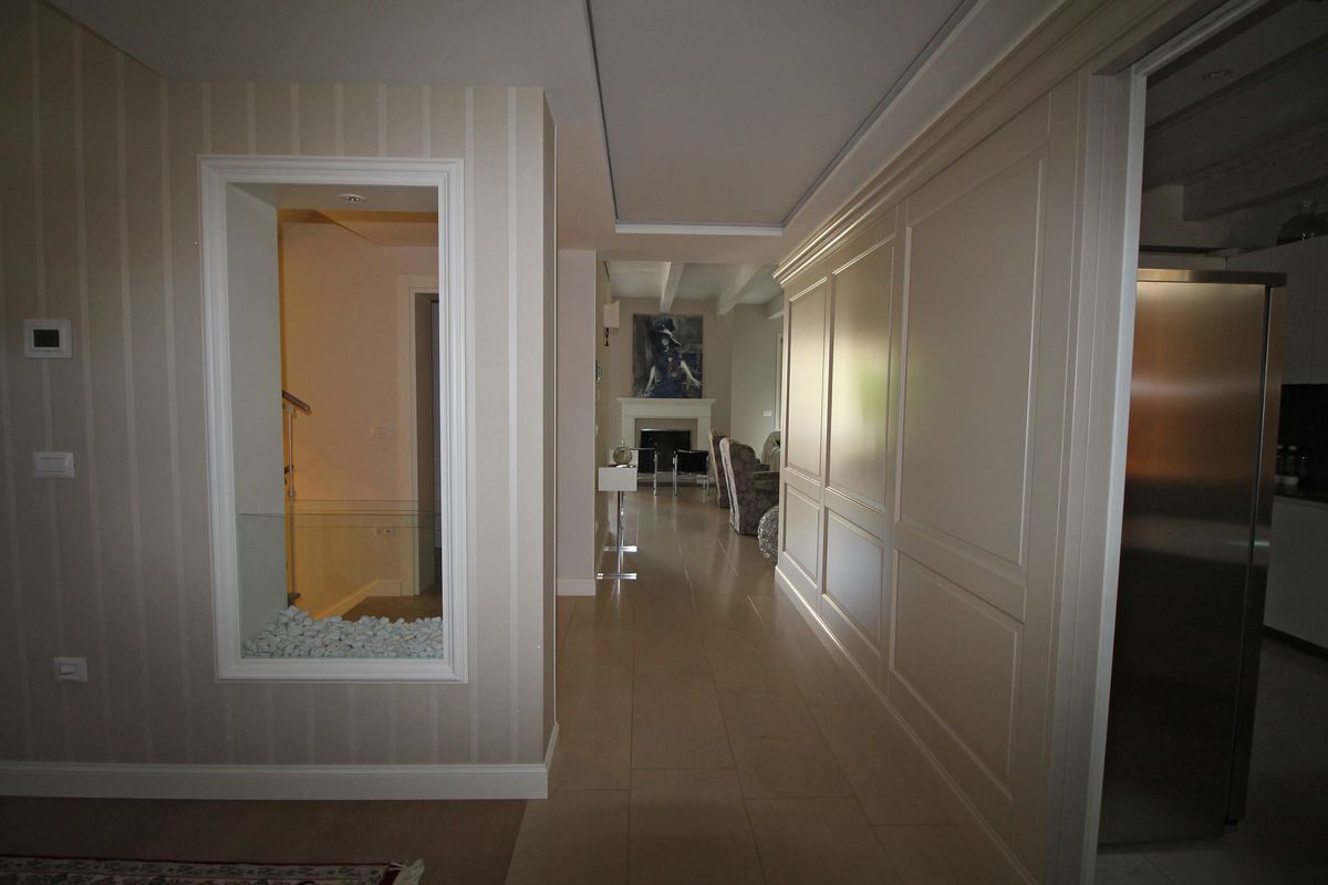 Tra le porte finestre di fronte all’ingresso è stato posto un camino. L’ambiente che ospita il camino è affacciato sul giardino ed è unico: una unica sala che permette di arredare la zona camino e di avere due spazi ben distinti, di dimensioni opportune, per la zona pranzo e la zona conversazione. Il piano notte è composto dai servizi e tre camere. Le finestre del piano terra sul fronte strada mantengono le proporzioni originali e sono protette con inferriate.