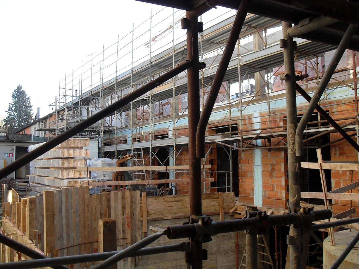 La demolizione di parti dell’edificio è avvenuta con l’ausilio di macchinari di piccole dimensioni e le macerie man mano venivano raccolte e trasportate in discarica. Gli accordi con il quartiere e l’amministrazione pubblica sono stati proprio quelli di procedere alla demolizione con l’impegno di contenere la polvere e sgomberate subito le macerie, anche per i brevi i tempi di permesso di chiusura delle strade. In seguito sono stati realizzati diaframmi e cordoli, isolamento dell’interrato e realizzazione della piastra a platea in c.a. Sempre in c.a. le pareti del piano semi interrato, la rampa di discesa e i vani scala.