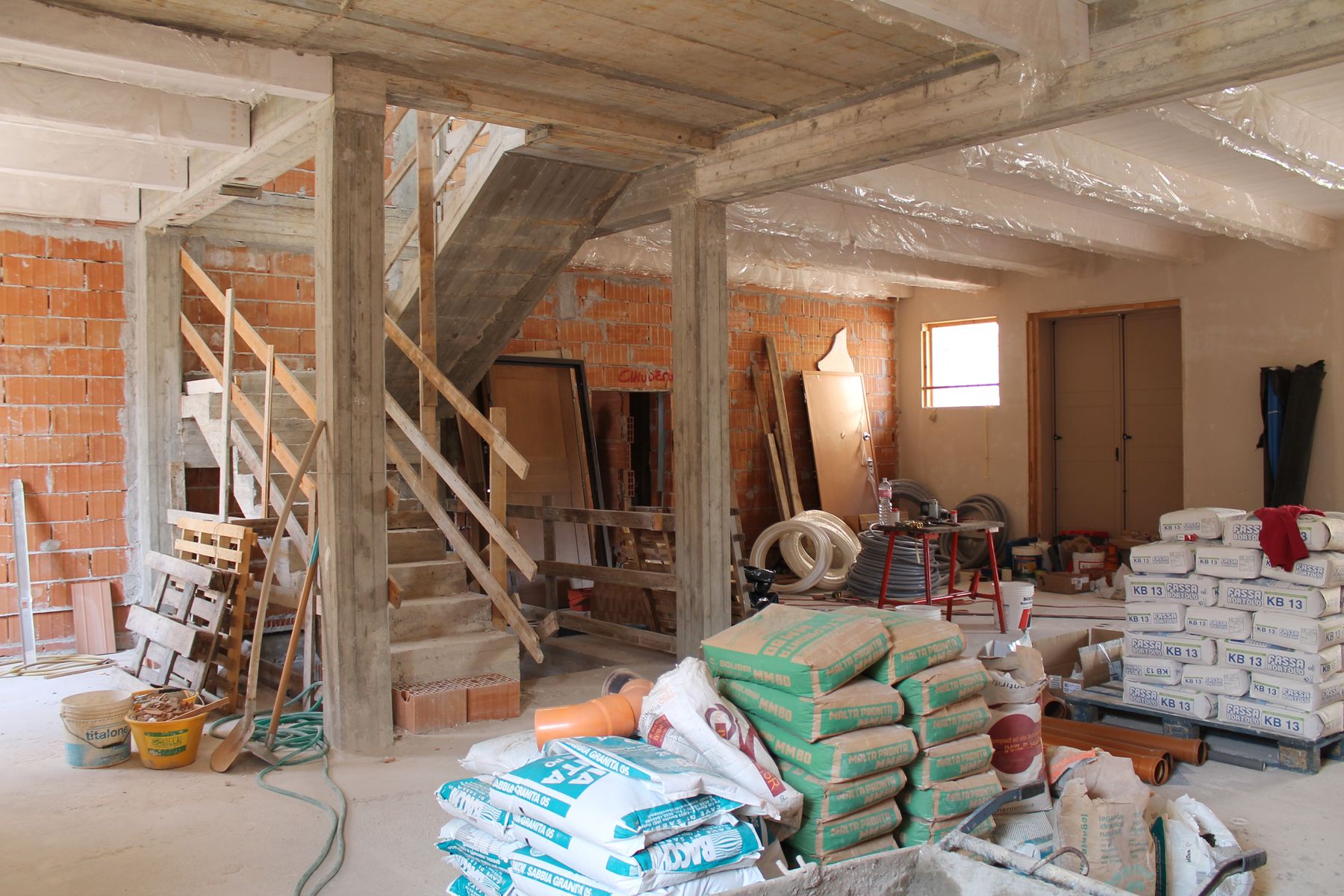 Vista del piano terra e del primo piano al grezzo e posizionamento degli impianti.