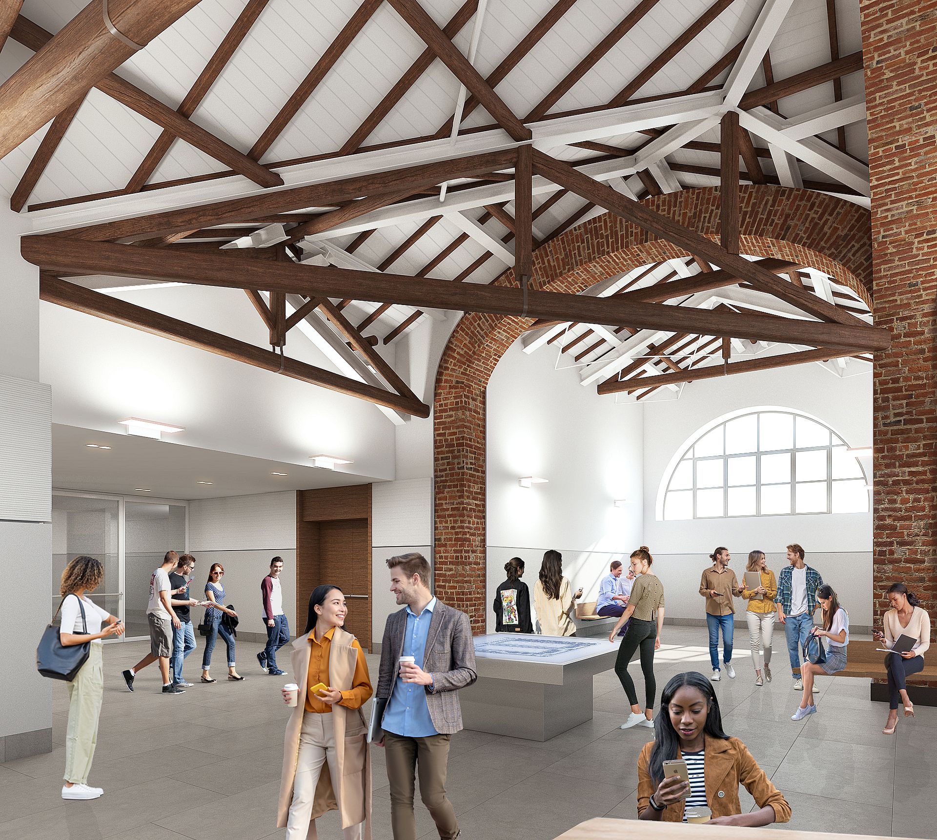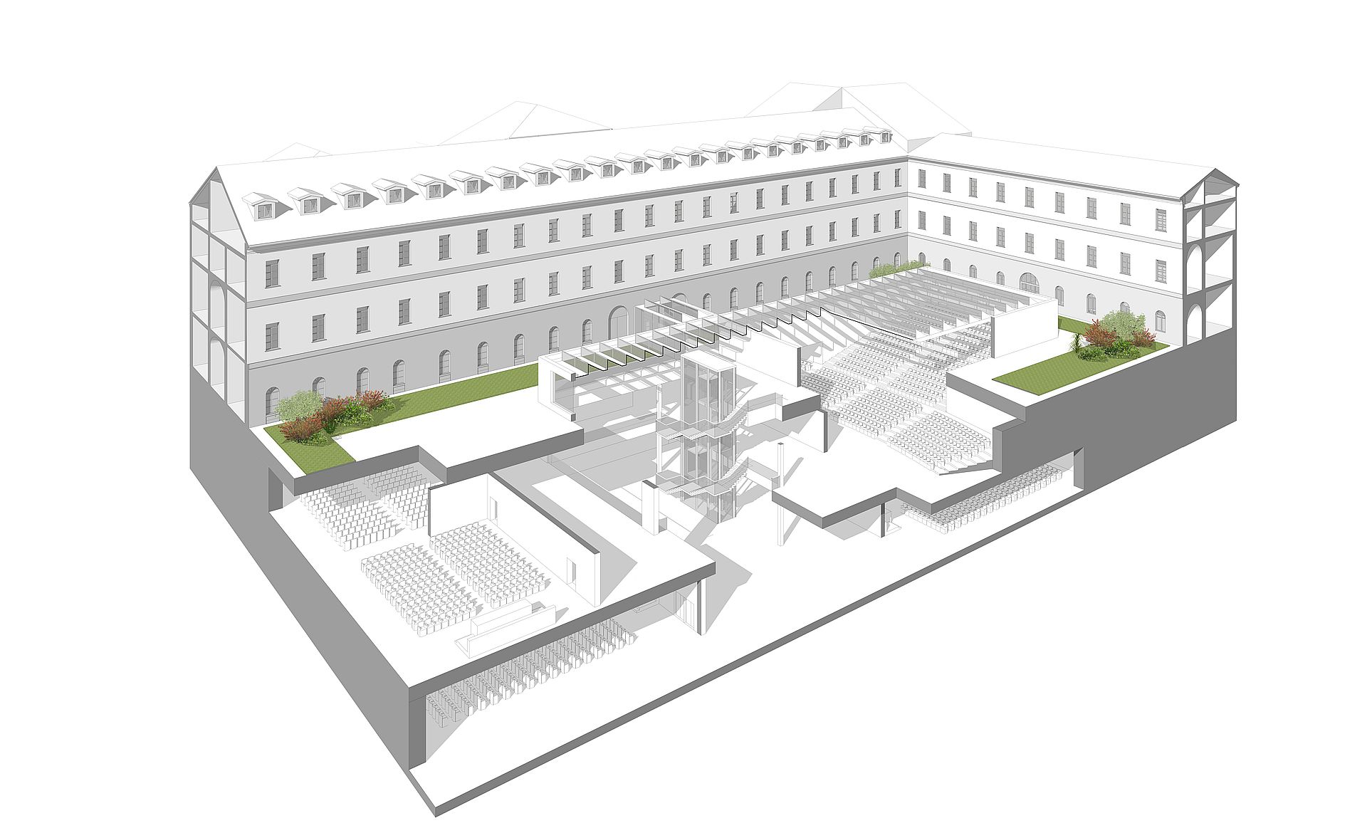 Il progetto degli allestimenti interni è volto al rispetto e alla valorizzazione delle caratteristiche architettoniche dell’edificio dedicando attenzione al comfort sia per quanto riguarda la maggiore permeabilità possibile alla luce naturale sia per le caratteristiche acustiche tramite pannellature fonoassorbenti per le pareti dei corridoi voltati, mentre l’illuminazione dei corridoi è prevista tramite l’installazione di corpi illuminanti progettati su misura e integrati nelle pannellature.