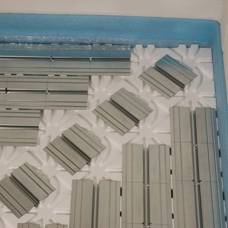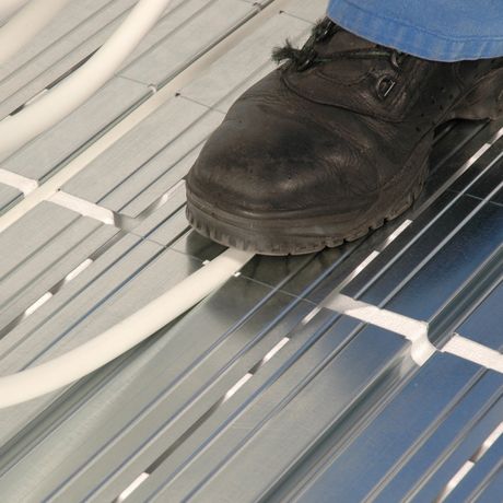 L’elemento base del sistema, in polistirolo espanso, ha uno spessore di 25 mm: il materiale svolge una funzione di isolamento termoacustico e contemporaneamente funge da supporto per le singole lamelle diffondenti portatubo in acciaio con spessore di 0,5 mm. La disposizione delle scanalature nel pannello permette una posa a chiocciola o a serpentina del tubo multistrato Oventrop Copipe HK 14 x 2 mm.