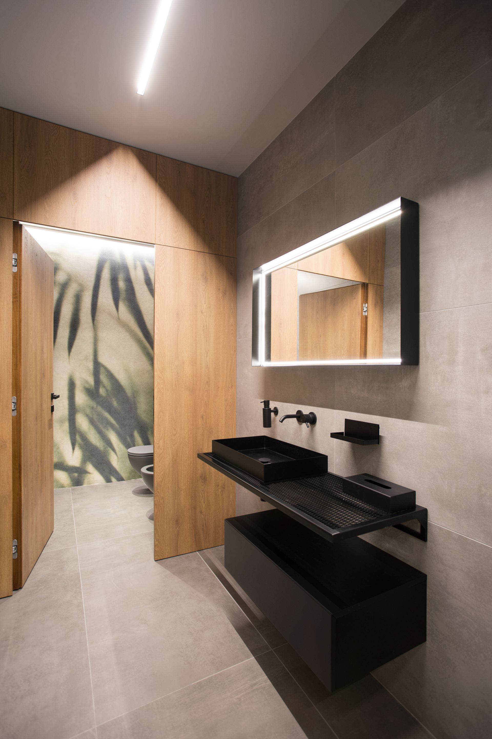I bagni, caratterizzati dalla presenza sulla parete di fondo di una carta da parati a tema naturale e dai toni caldi, combinano elementi di design dal gusto industriale e ricercato con rivestimenti fortemente materici in legno e ceramica effetto cemento.