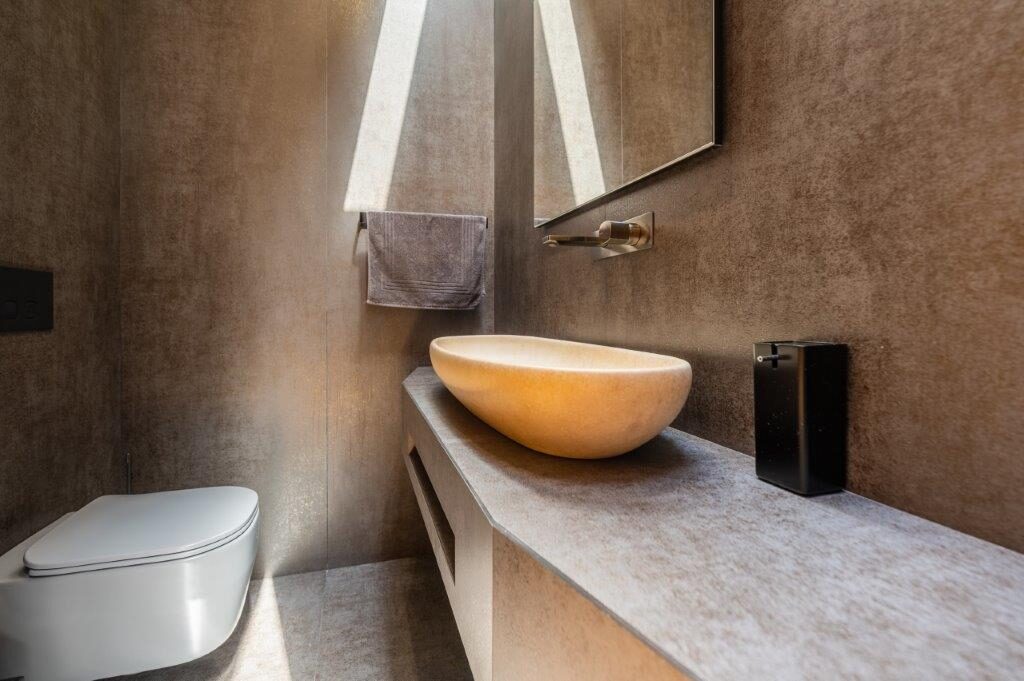 Nei bagni le pareti sono state rivestite interamente e sono presenti dei raffinati lavabi a incasso per una maggiore pulizia delle linee. Ritmonio è il brand scelto per questo progetto: il rubinetto ideale per questa realizzazione fa parte della serie Haptic, in finitura cromo nero spazzolato. La scelta è legata al suo design e alla possibilità di personalizzare il comando della rubinetteria, senza dimenticare la componentistica tecnica dell’incasso universale che ha permesso una rapida installazione.