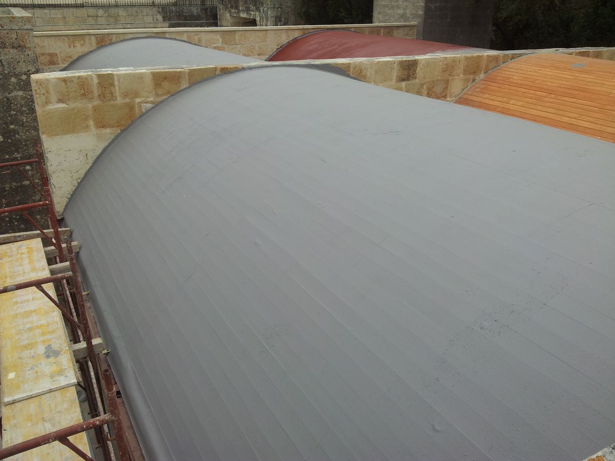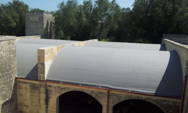 L’intervento, eseguito dall’impresa Edil Piscine di Galati Donato di Maglie (Le), ha previsto l’applicazione di Elastiflex e Tnt armatura tessuto non tessuto di Berner. Per l’esecuzione del lavoro sono state posate 3 mani di Elastiflex (grigio-rosso-grigio), ottenendo una soluzione estetica continua ed estremamente armonica con il costruito storico e i colori dell’ambiente circostante, oltre a una protezione duratura della copertura dalle infiltrazioni di acqua.