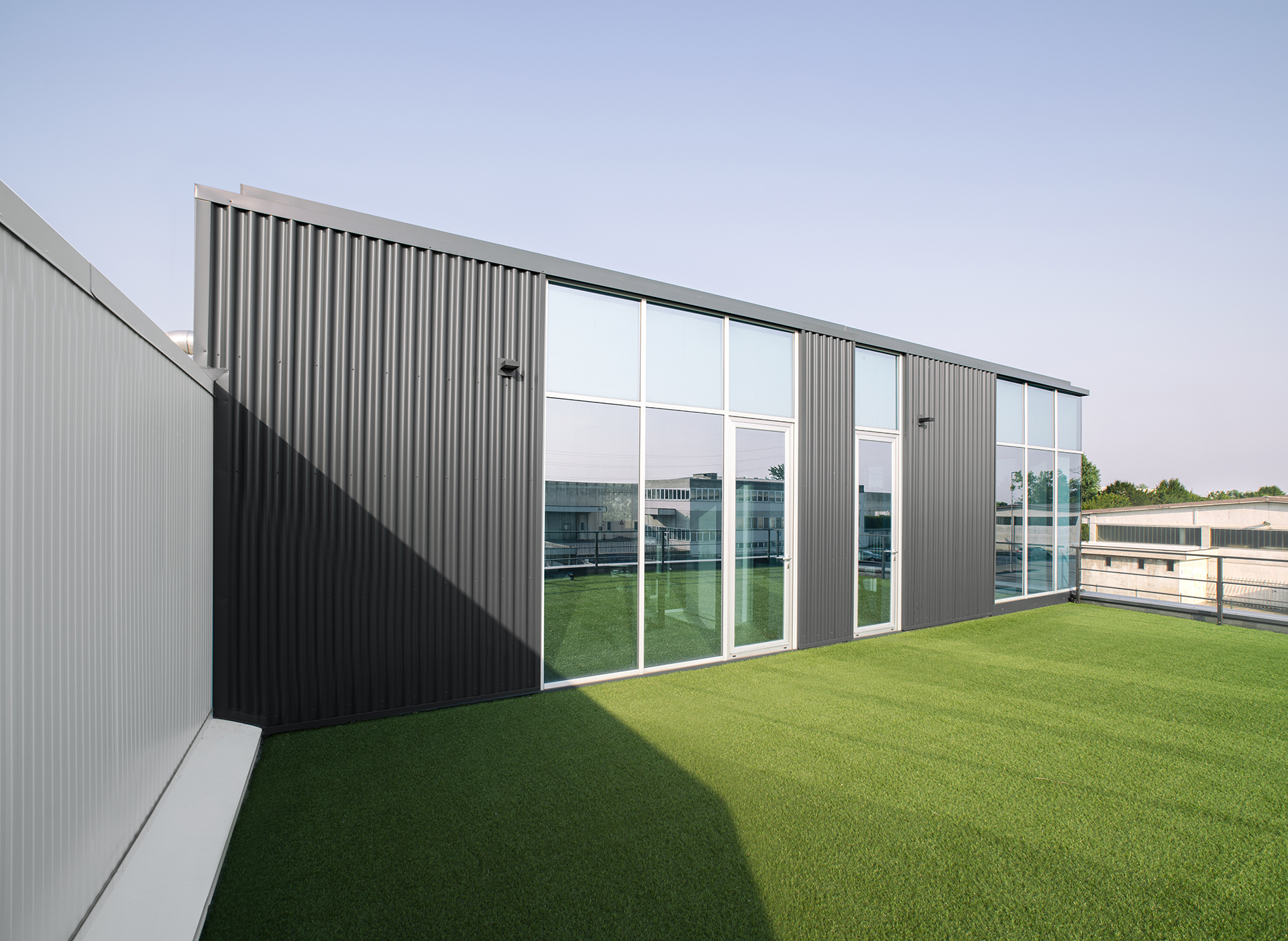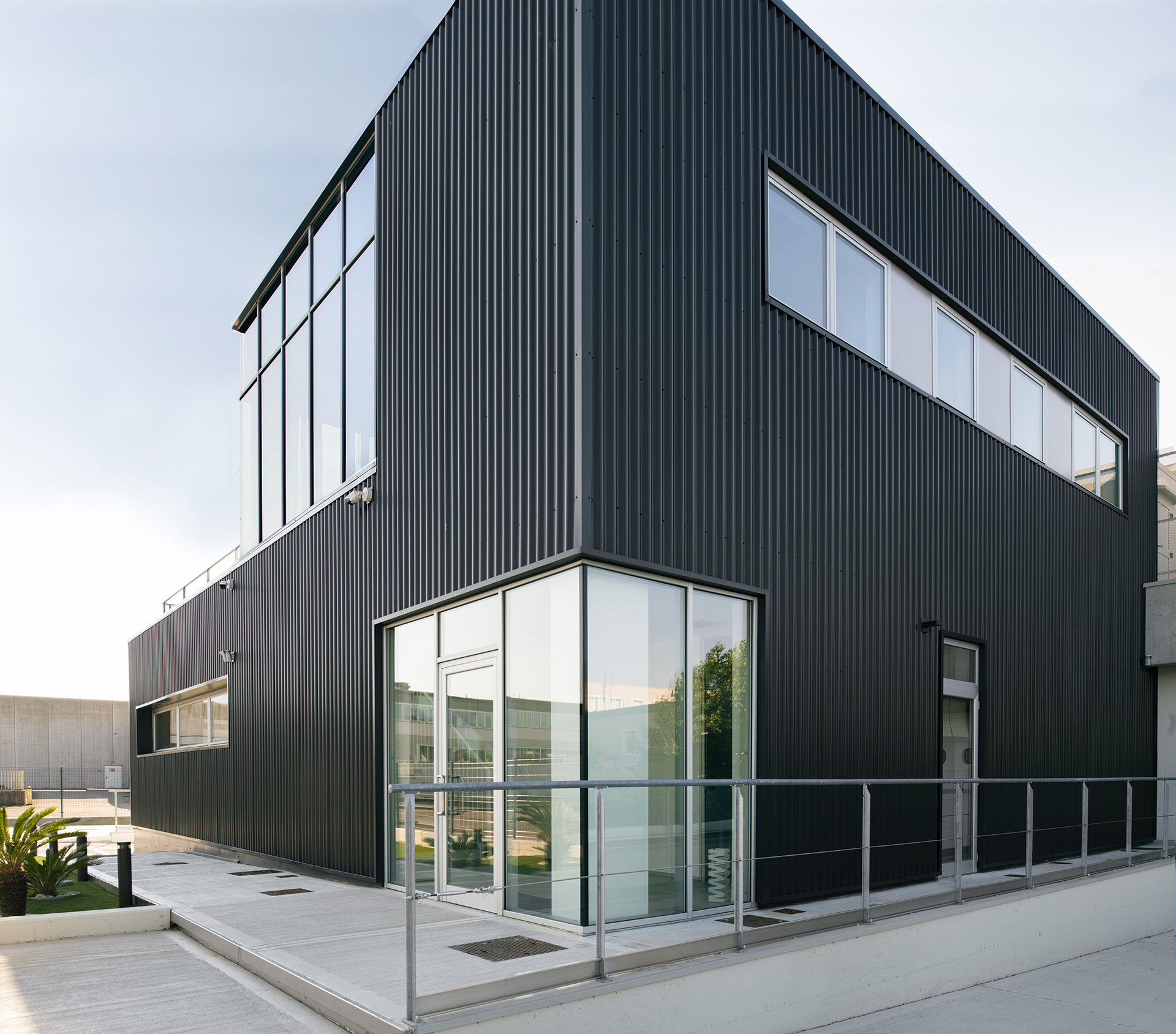 Per ottenerlo i progettisti hanno puntato sull’utilizzo di strutture prefabbricate in calcestruzzo e con le finiture: parte delle facciate sono in calcestruzzo, parte sono rivestite con le lastre Ond-All 33 di Alubel color grigio antracite in cui s’inseriscono grandi vetrate. L’uso del rivestimento metallico, scuro e lucido, caratterizza così l’edificio, che appare moderno ed elegante, fortemente riconoscibile.