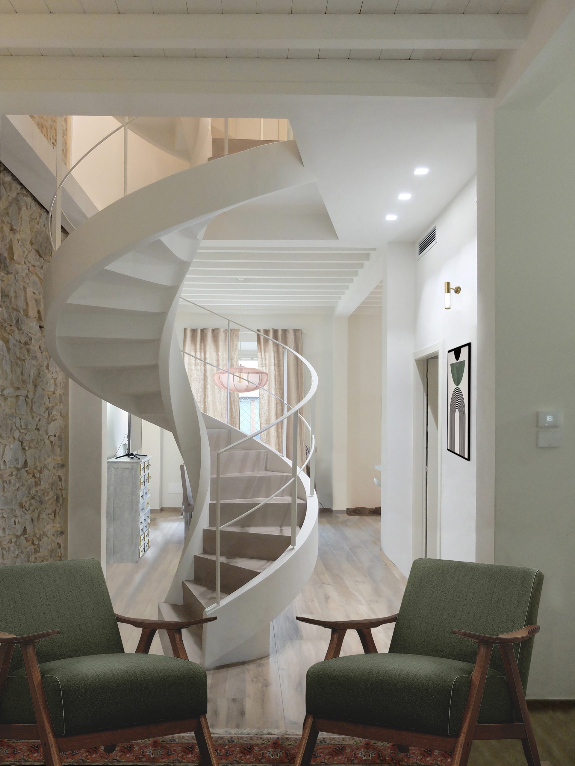 La scelta della scala a chiocciola ha permesso, altresì, di creare un cono di luce che, partendo dai lucernari della soffitta, permea attraverso i piani fino al livello terra. Questa caratteristica non solo ha migliorato la luminosità interna, ma ha anche dato vita a una connessione visiva e spaziale tra i diversi livelli, conferendo all’abitazione un’atmosfera aperta e ariosa.