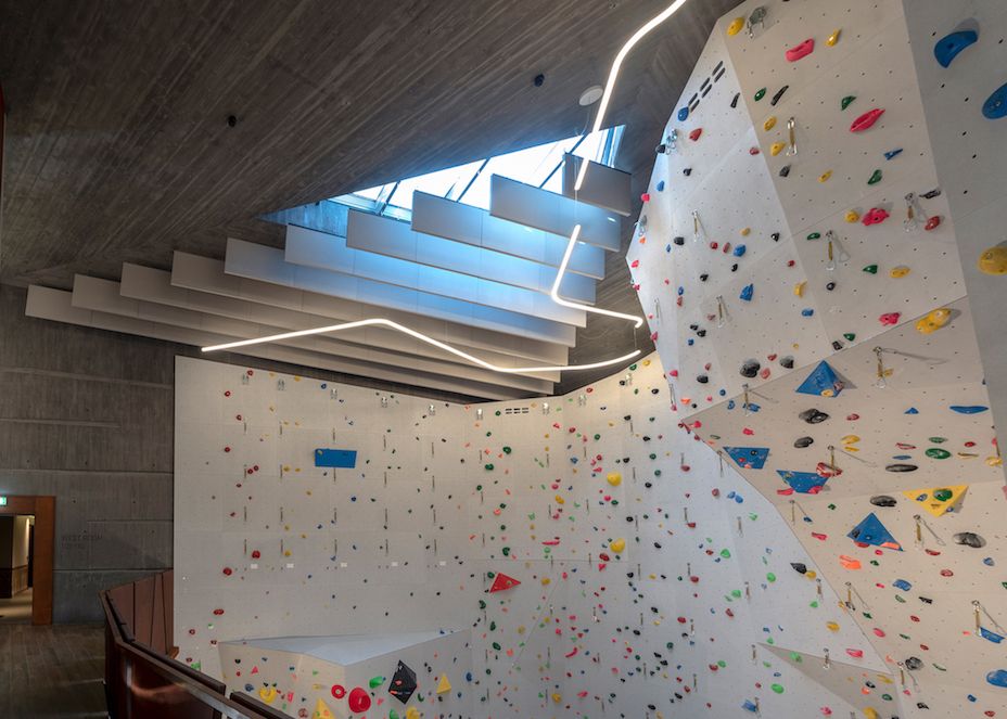 Rockfon è presente anche nella parete di arrampicata interna: il team dello studio BladIdea ha scelto di utilizzare i baffles acustici senza cornice Rockfon Contour, una soluzione funzionale, facile da installare che ha permesso, grazie alla verticalità dei suoi elementi, di far entrare all’interno della sala la luce naturale, oltre a garantire una condizione acustica confortevole che aiuta alla concentrazione e a ottimizzare l’esperienza.