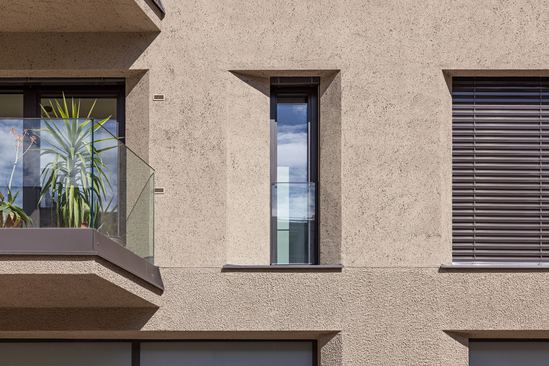 Le finiture in facciata, realizzate con due texture differenti della linea Kreativ di Röfix, conferiscono all’edificio un carattere unico e contemporaneo.