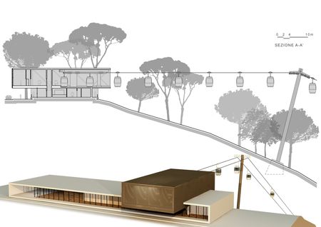 Come le cabinovie sciistiche, la teleferica è munita di una stazione di partenza, di due piloni e di una stazione di arrivo. L’idea è quella di sistemare la stazione di partenza sulla fascia di terreno inutilizzato che separa via dei Gladiatori da via dello Stadio Olimpico senza abbattere alcun pino. L’architettura della stazione di partenza si basa su una semplice strategia: deve consentire una partenza molto ripida delle cabine, in modo da non interferire con il traffico veicolare su via dello Stadio Olimpico.