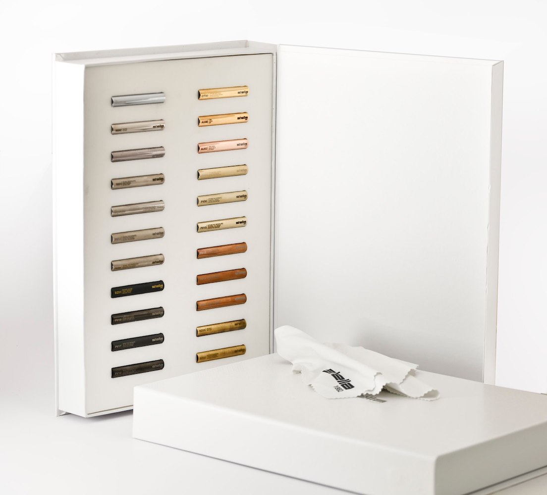 Rubinetterie Stella ha messo a punto una nuova “Palette” finiture con 22 varianti, replicabili per ogni serie, che permette già nelle prime fasi di progettazione di poter visionare e scegliere quella più adatta per il proprio progetto, confrontando cromie, lavorazioni delle superfici e resa della marcatura laser.