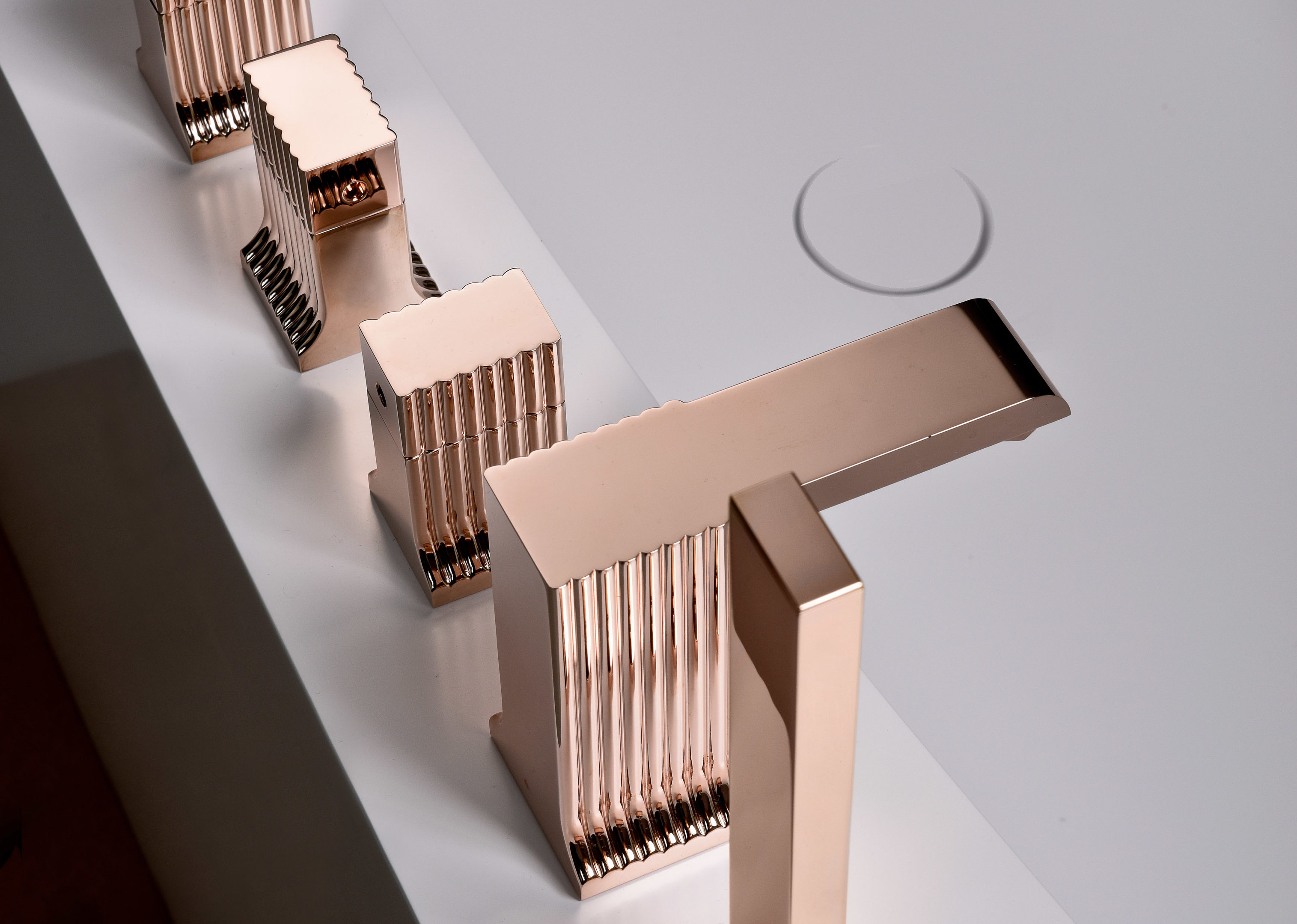 I rubinetti hanno volumi importanti, con le superfici cannettate che rimandano alle lesene classiche, ma presentano un’assoluta armonia di proporzioni e offrono, oltre alla perfetta efficienza funzionale, anche un piacevole impatto estetico esaltato dalla pulizia e dalla sobrietà stilistica.
