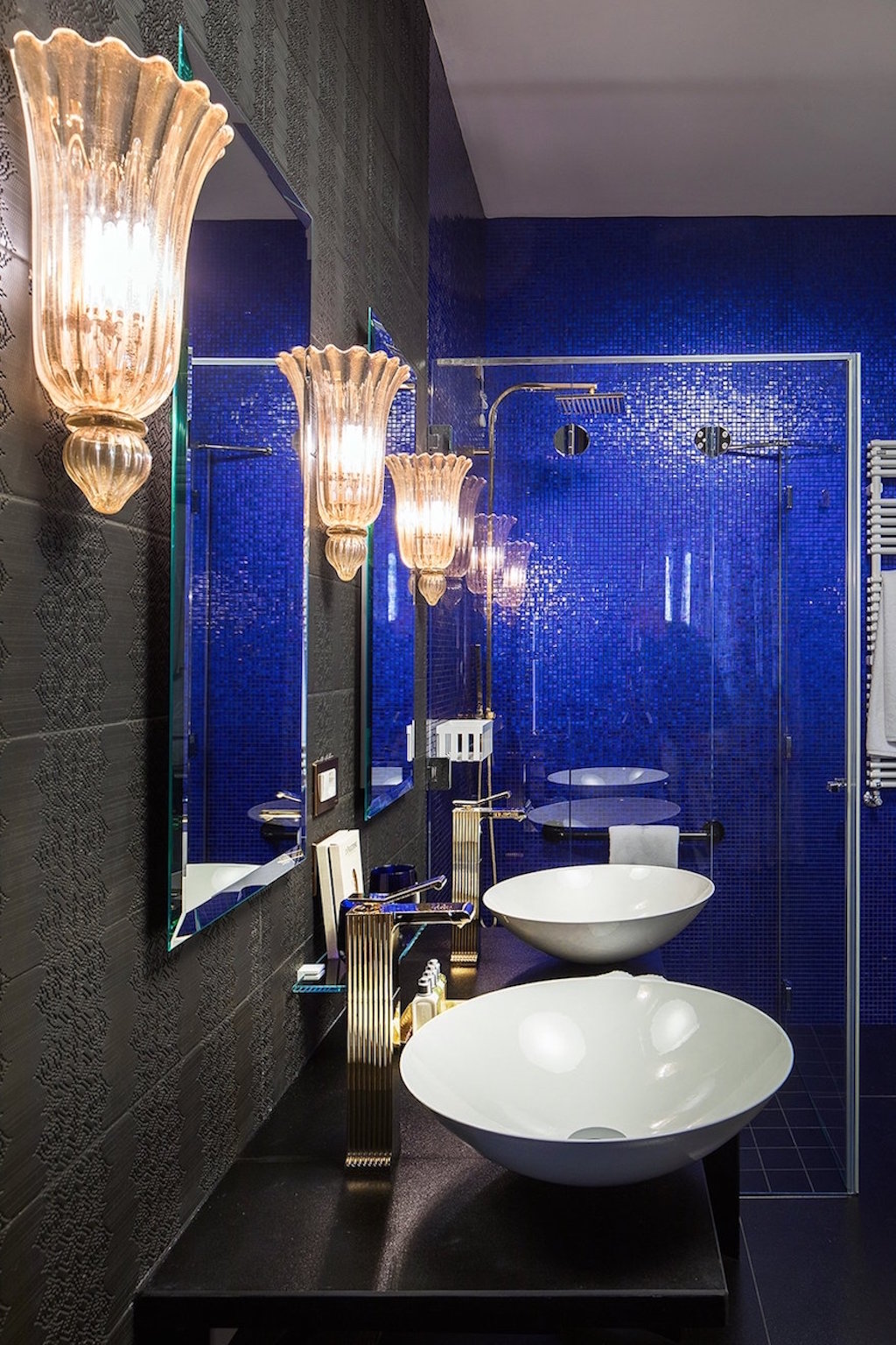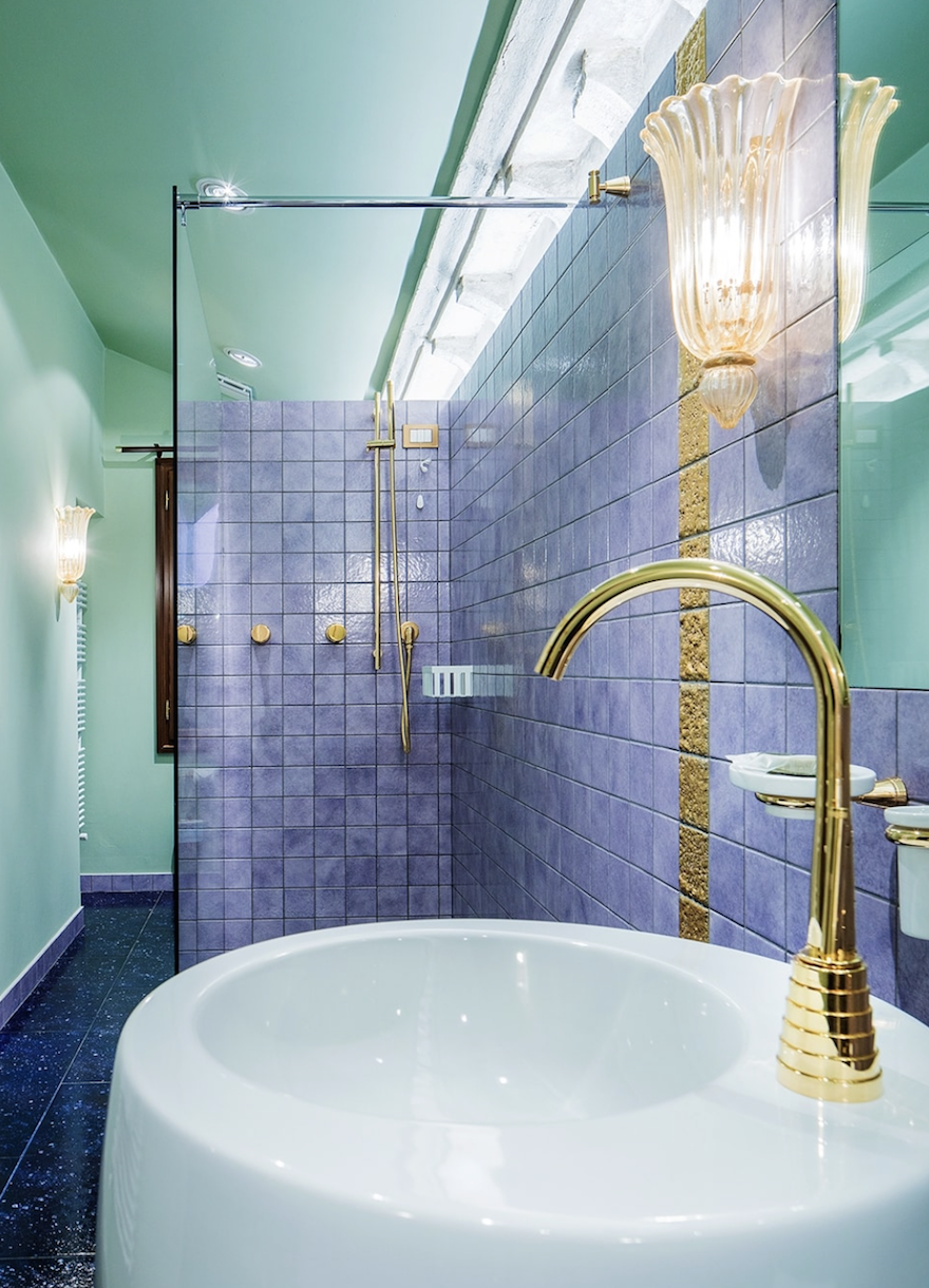 Suggestive e lussuose, le sale da bagno dell’Hotel Heureka di Venezia, grazie anche alle linee contemporanee Titian di Michele De Lucchi e Casanova di Maurizio Duranti.