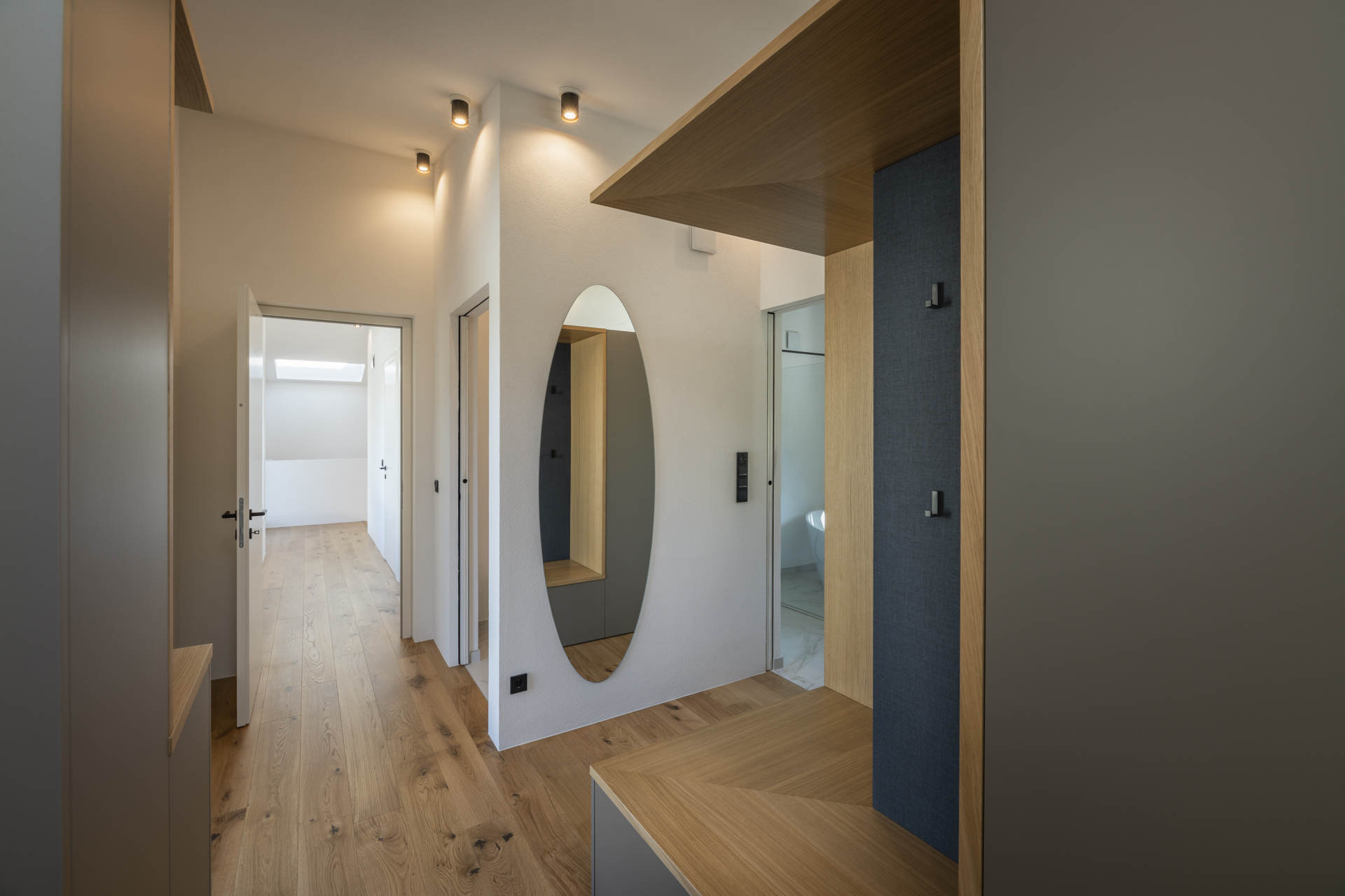 La camera da letto si trova al primo piano: qui si trovano anche un’ampia cabina armadio e il bagno luminosissimo, mentre dalla seconda camera da letto, anch’essa con bagno, si accede alla grande terrazza pavimentata in legno scuro a richiamare quello delle pareti.