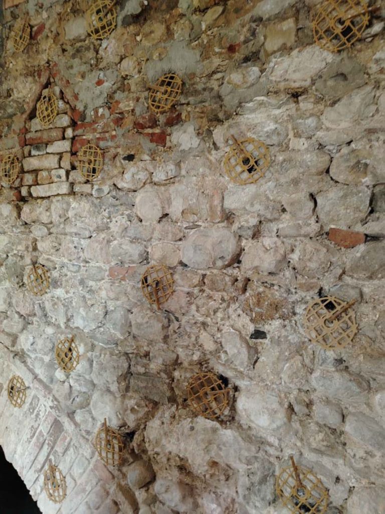 Ristilatura armata dei giunti: ripristino delle fughe e inserimento di connettori trasversali per ristabilire la continuità meccanica tra i paramenti murari.