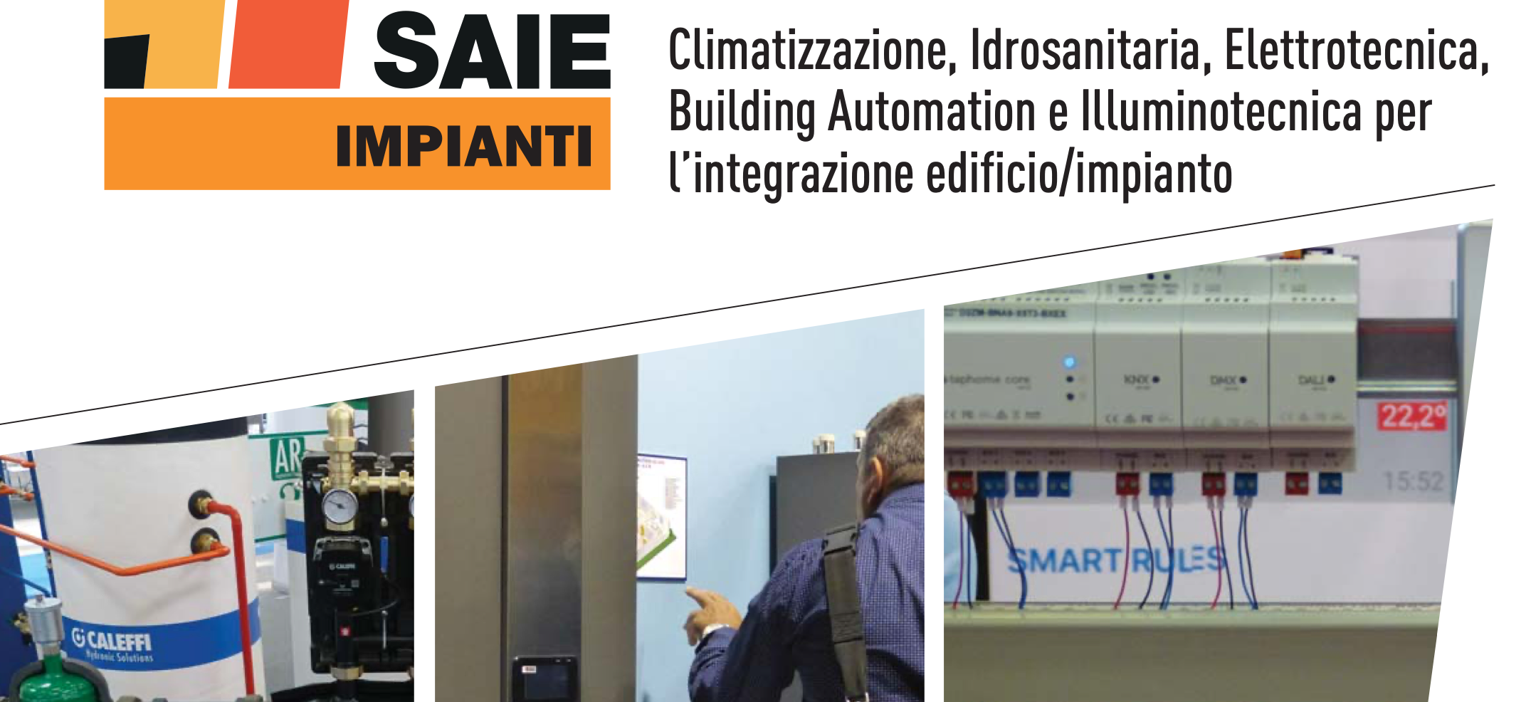 Sistemi di ventilazione, condizionamento e riscaldamento – Prodotti per impiantistica idrosanitaria – Attrezzi e accessori per impiantisti – Sistemi di gestione delle acque – Impiantistica elettrica per l’edificio – Impianti e sistemi antincendio – Sistemi di telecontrollo per l’edificio – Automazioni, sistemi di controllo accessi, sistemi antinstrusione – Sistemi di illuminazione – Impianti solari e fotovoltaici e di produzione energia – Digital building, smart home e digital cities – Smart infrastructure – Impiantistica sportiva e outdoor.