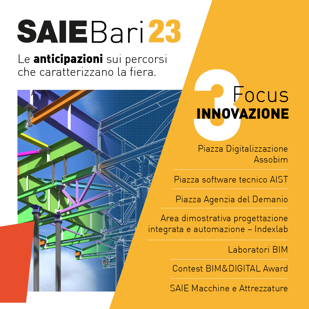 - Piazza Agenzia del Demanio: Gestore del patrimonio dello Stato, e leader nel settore BIM tra le Pubbliche Amministrazioni, l’Agenzia del Demanio parteciperà a SAIE Bari 2023 attraverso l’allestimento di un’area dedicata ai temi del BIM, del “Patrimonio Digitale” e della valorizzazione degli immobili dello Stato, per raccontare la digitalizzazione del processo edilizio e per presentare iniziative e progetti dell’Agenzia dedicati al BIM insieme ai loro protagonisti.