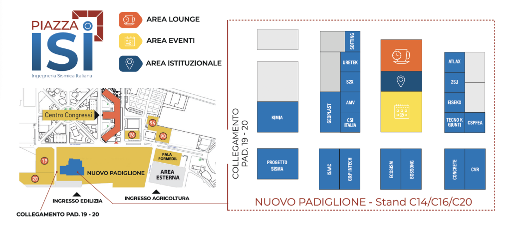 Nell’area espositiva di Piazza Isi saranno presenti 19 aziende associate a isi, tra cui 2S.I., Amv, Atlax, Bossong, Concrete, Csi Italia, Cspfea, Cvr, Ecosism, Eiseko, G&P Intech, Geoplast, Isaac, Kimia, Progetto Sisma, S2X, Softing, Tecno K Giunti e Uretek Italia.
