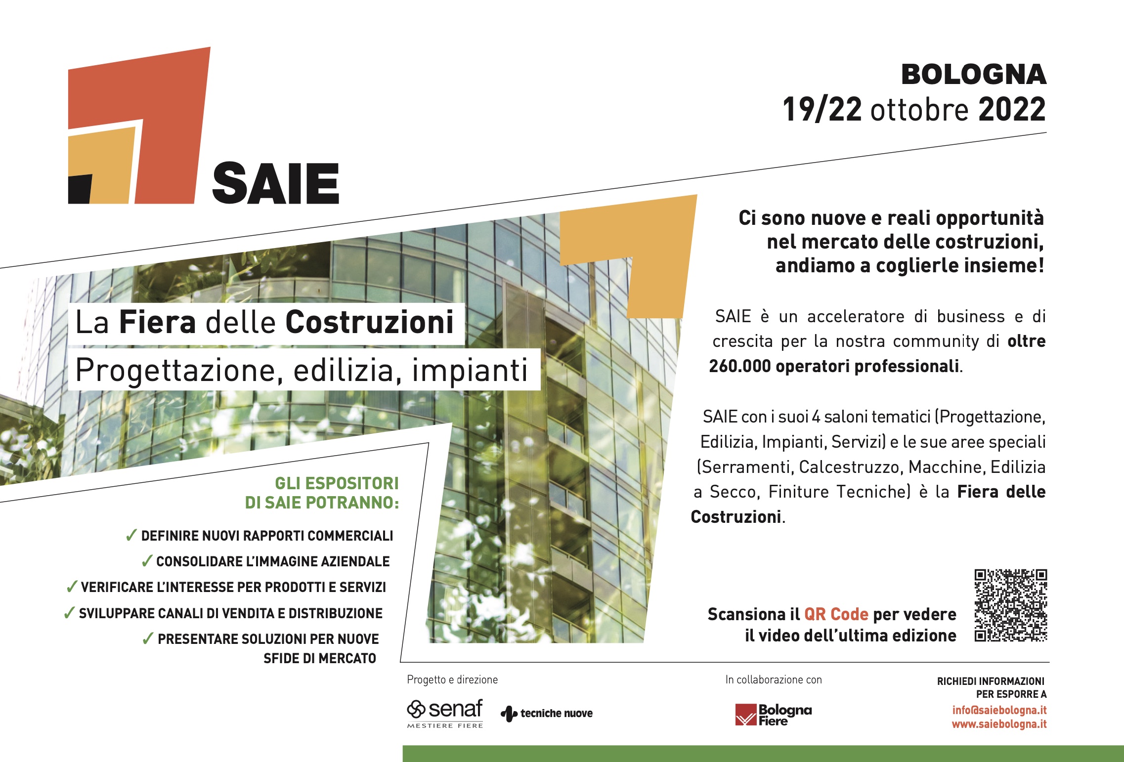 Maggiori informazioni sul percorso Saie Sostenibilità a Saie 2022 (BolognaFiere, 19 – 22 ottobre) possono essere richieste a info@saiebologna.it, mentre la brochure ufficiale della fiera è disponibile QUI.