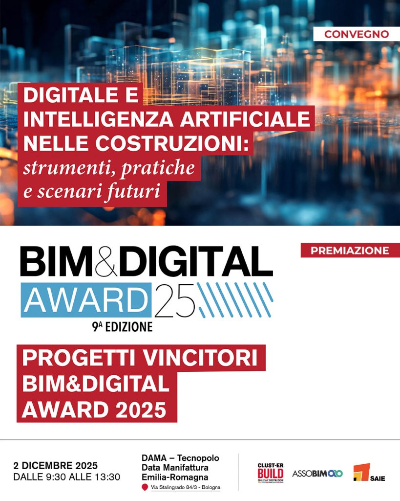 Il 2 dicembre 2025 a Bologna si terrà il convegno “Digitale e Intelligenza Artificiale nelle costruzioni: strumenti, pratiche e scenari futuri, accompagnato dalla premiazione dei Bim&Digital Award.